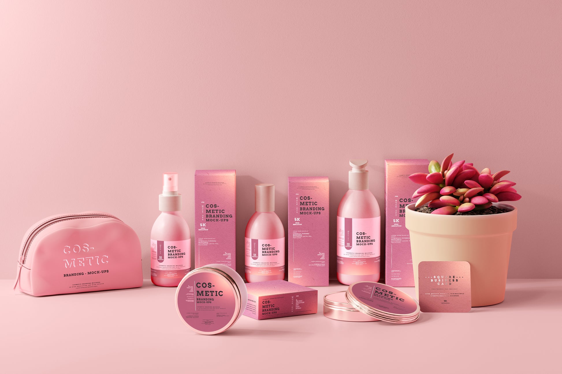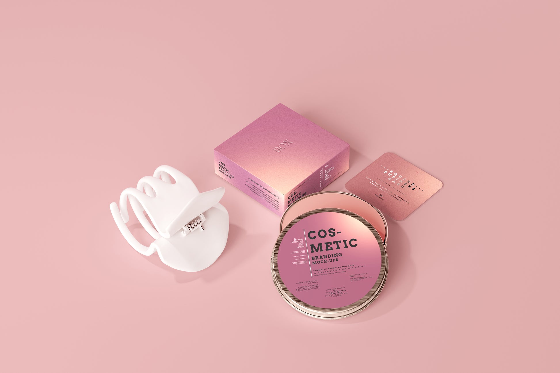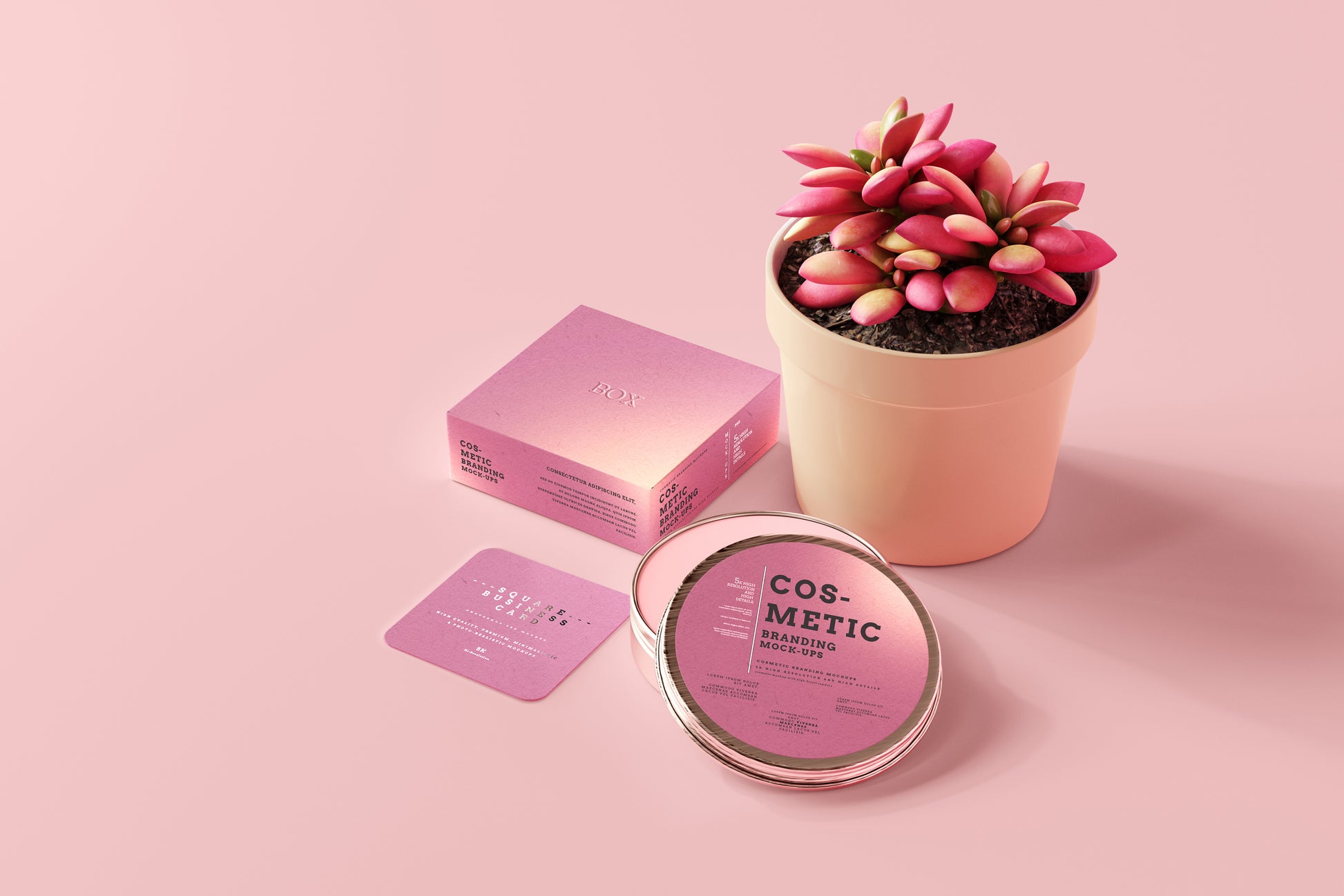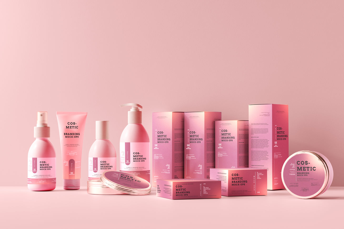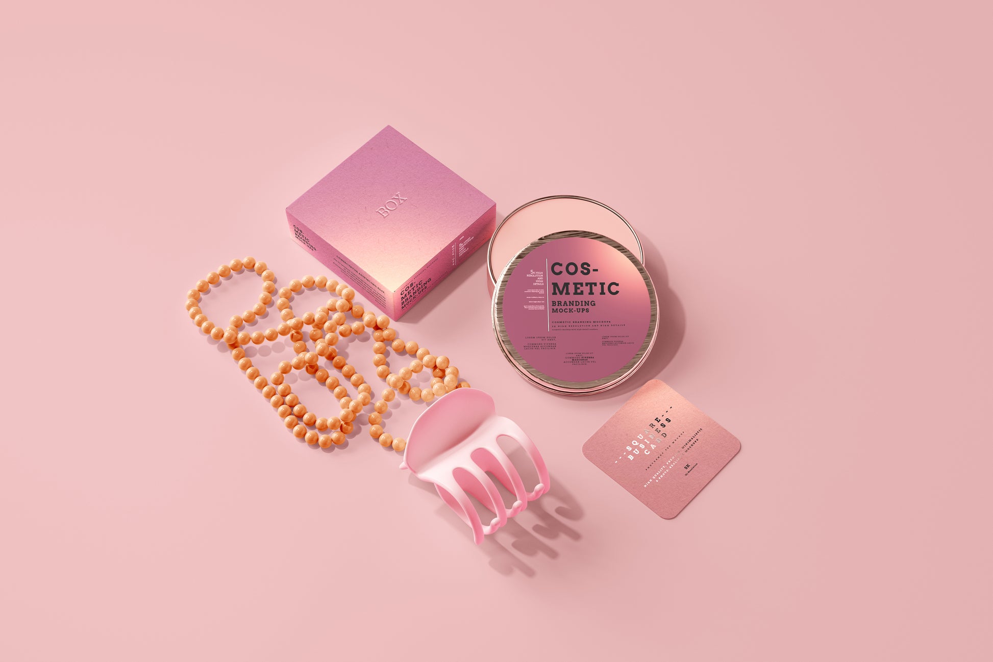 101x Cosmetic Branding Mockup Scenes featuring 6x packaging containers with boxes.