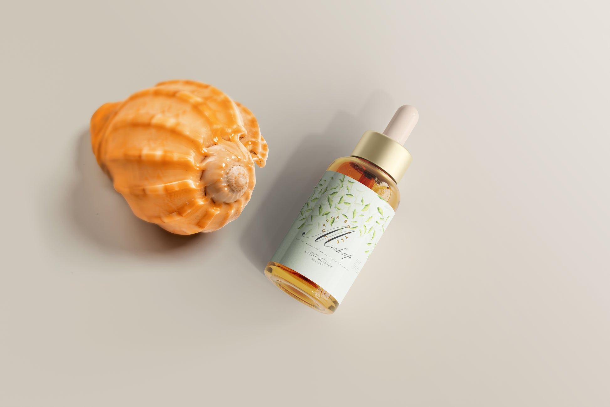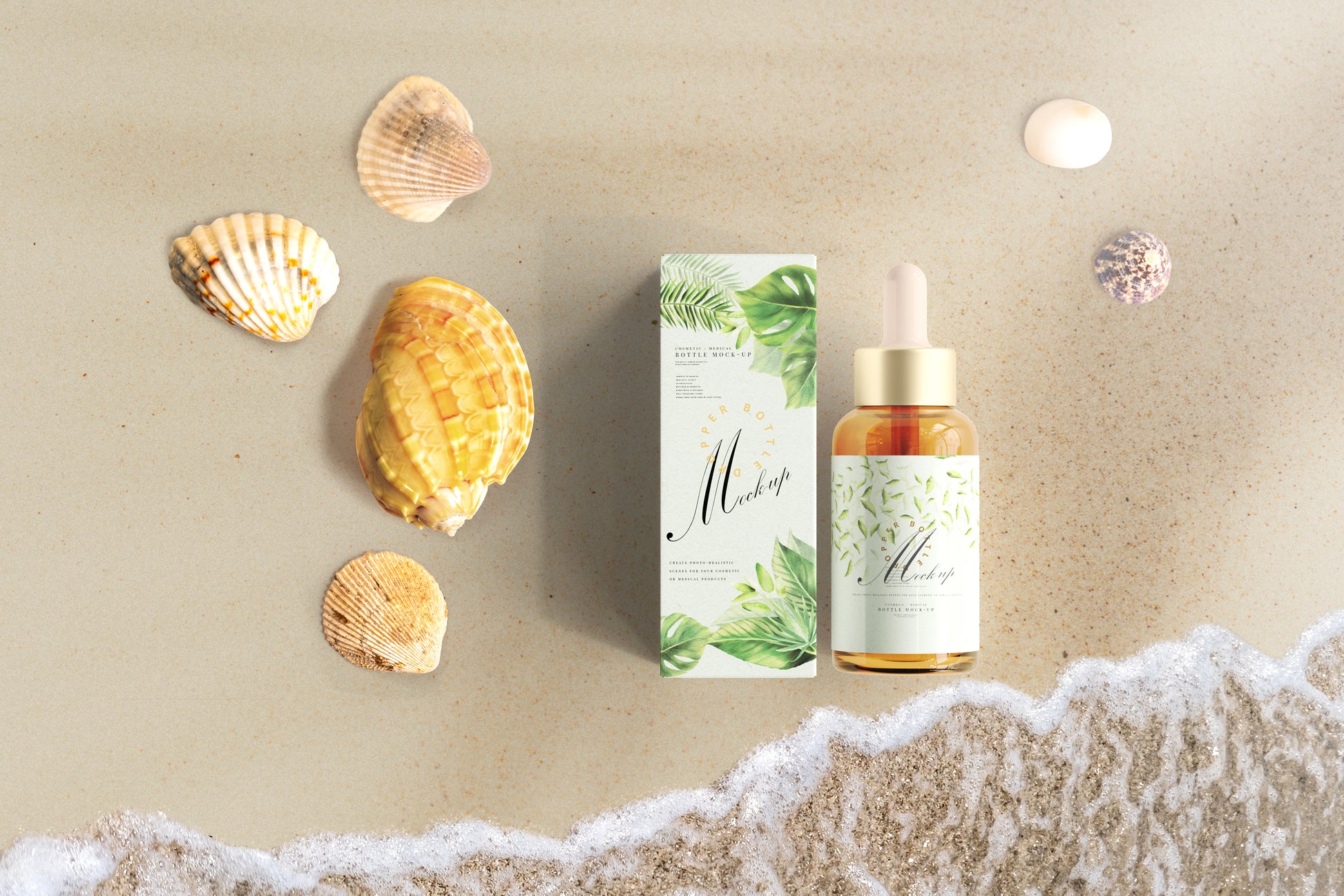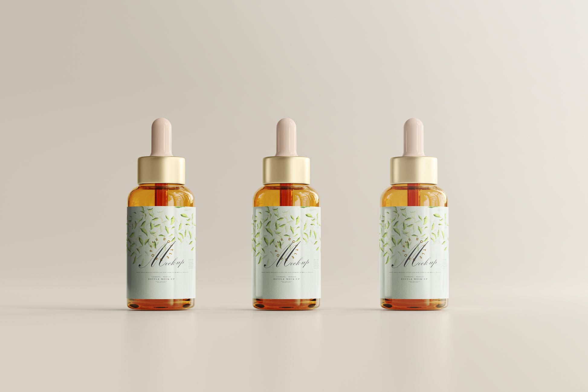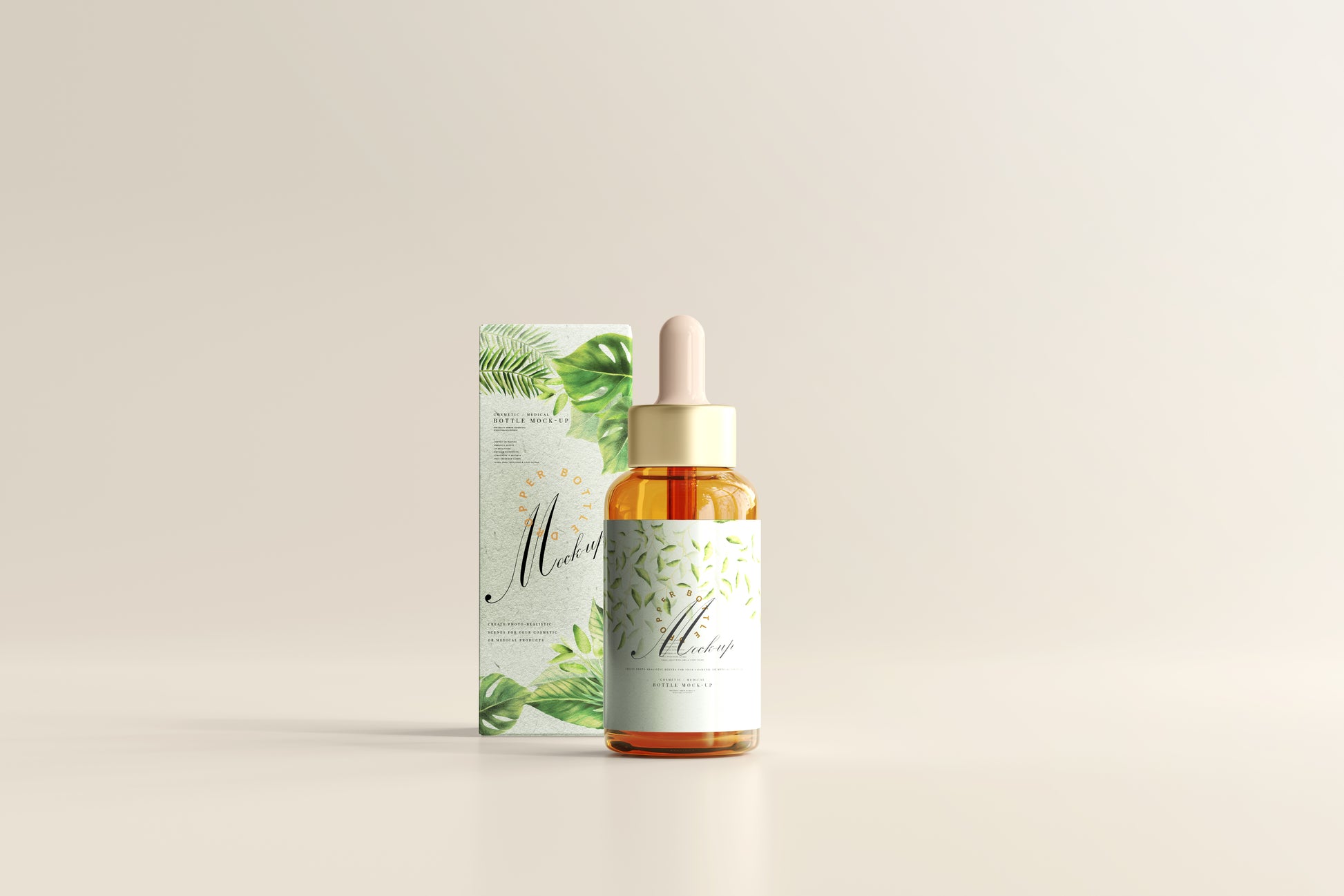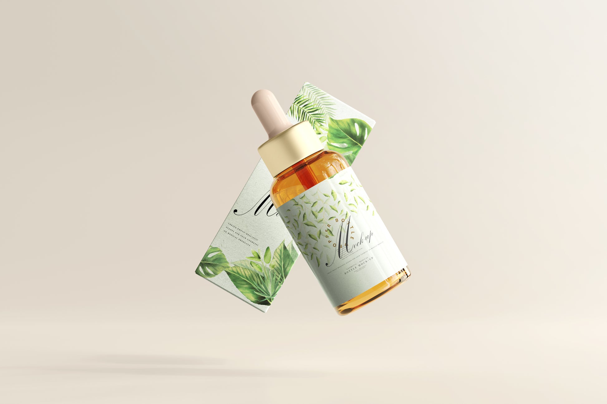 dropper bottle mockups with outer packaging and inner bottle. includes 15x scenes with various setups and viewing angles.