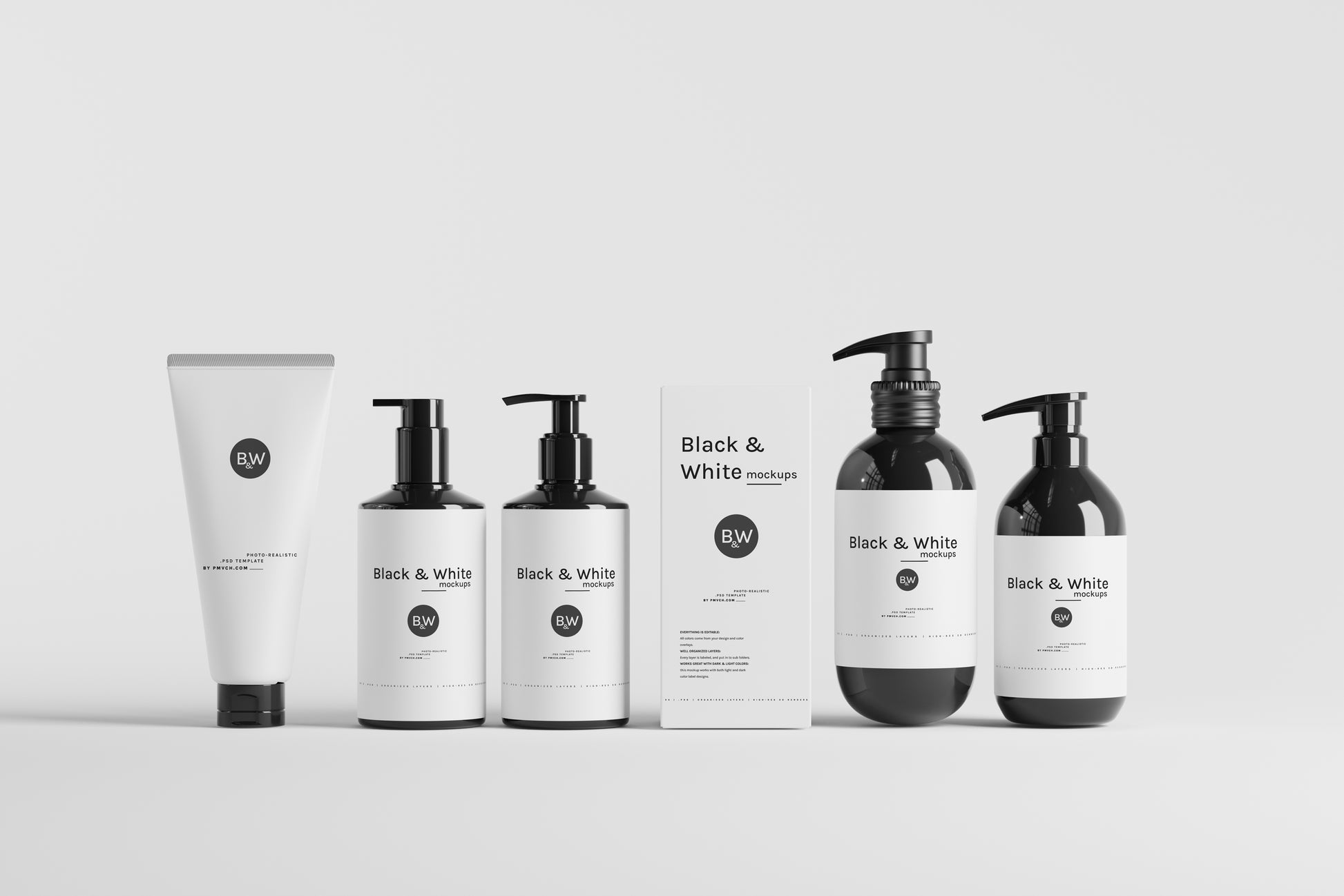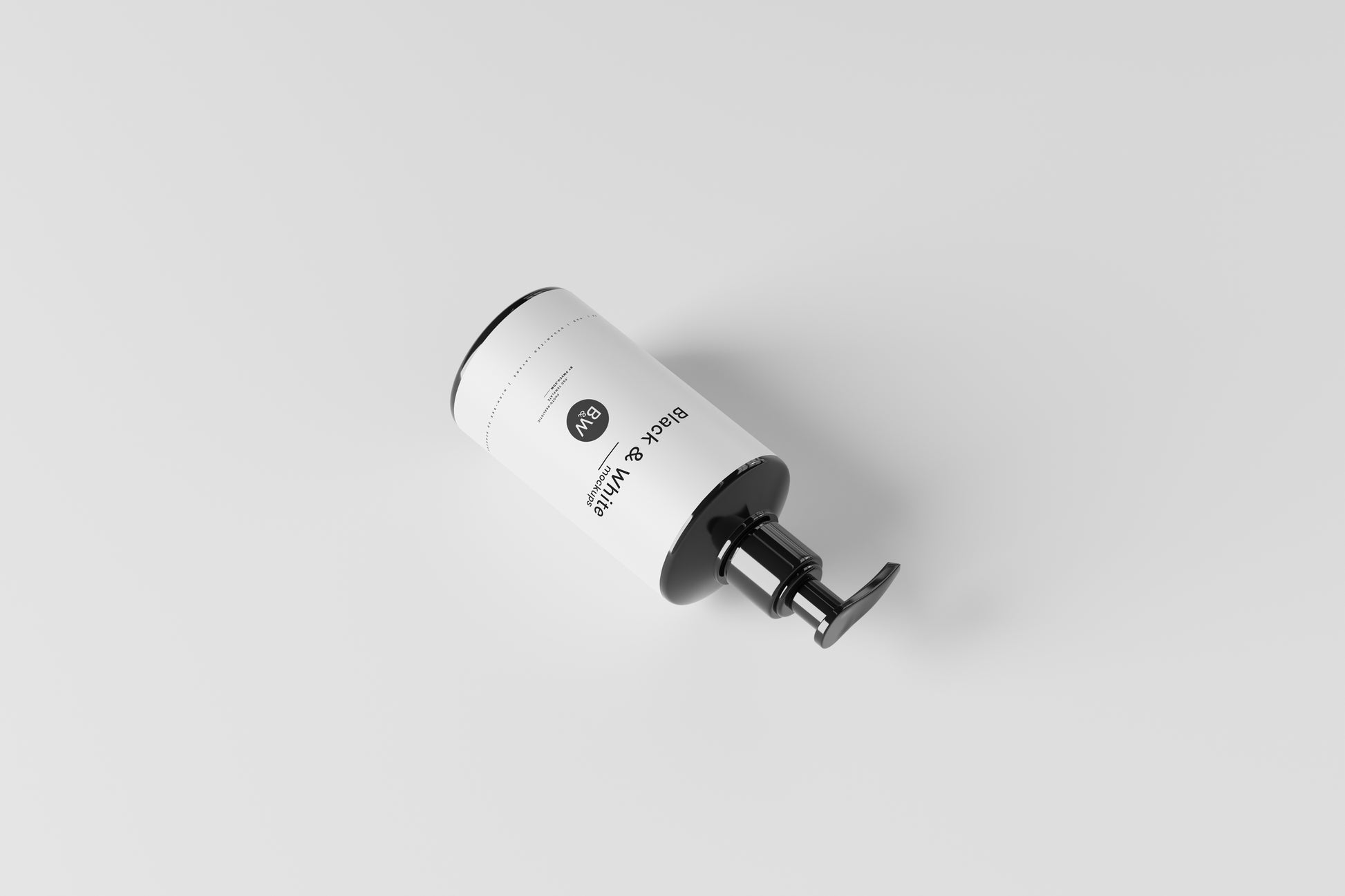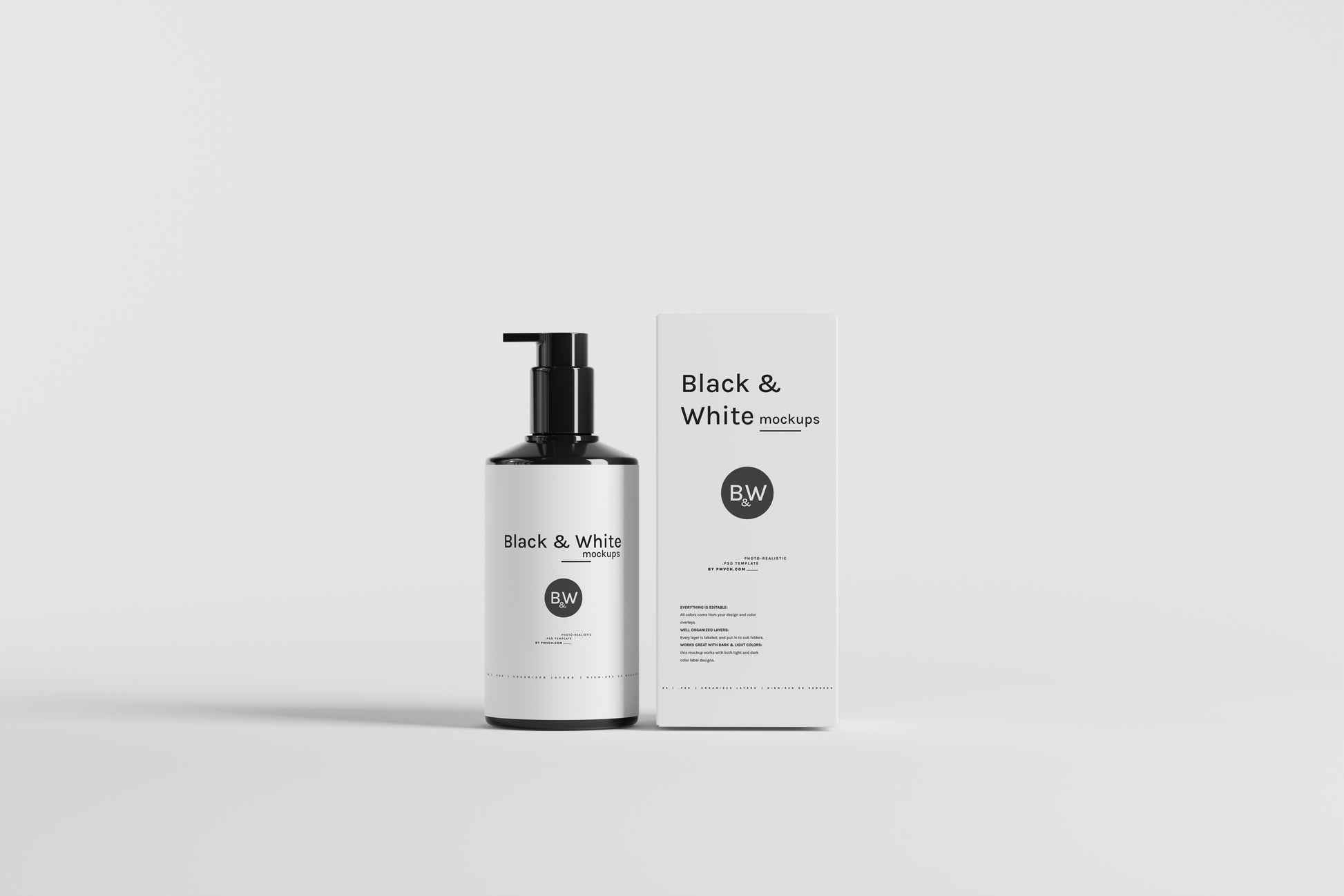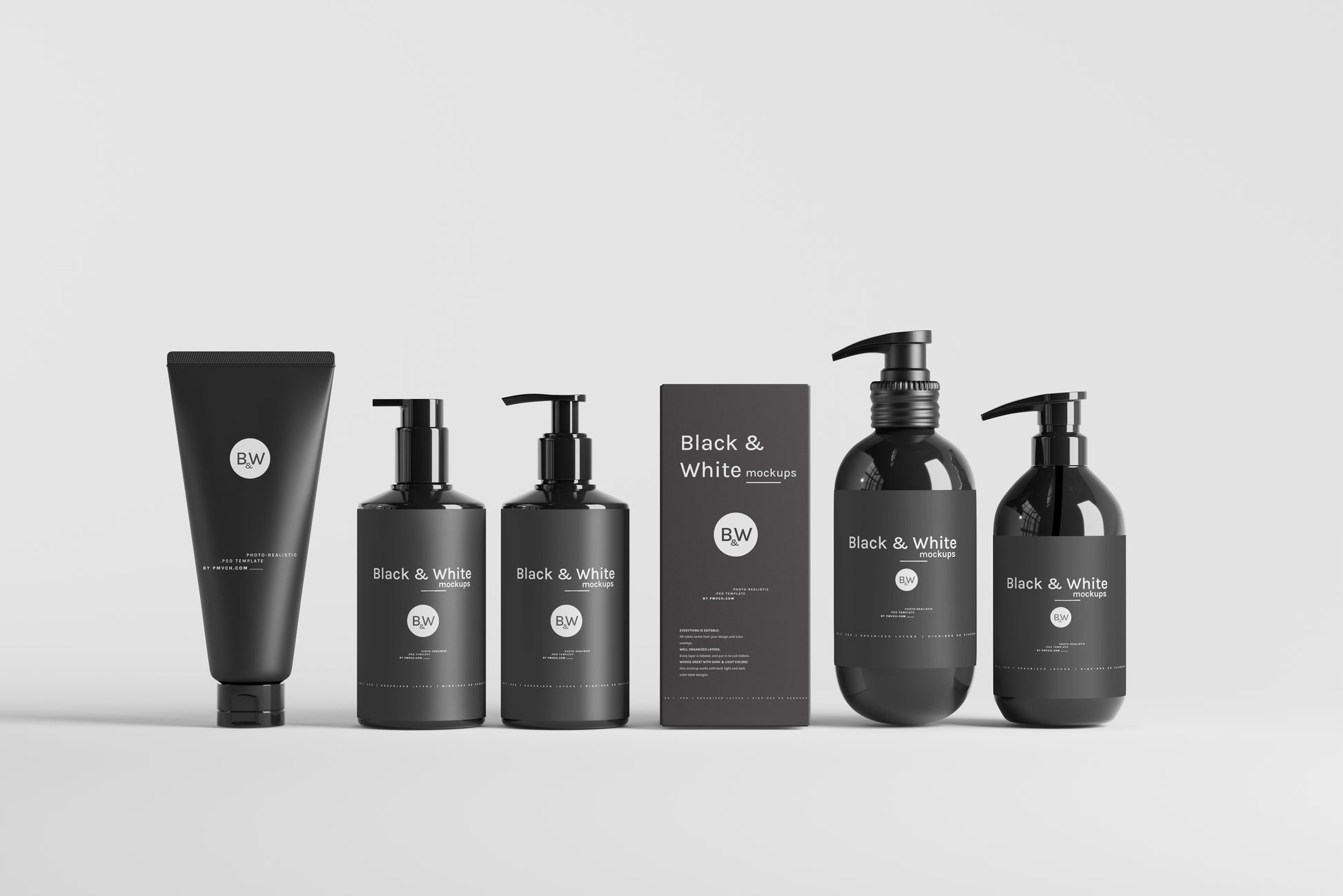This mockup set focuses on pump bottles and is specifically tailored for black and white labels. However, it can also be used with labels of any color, and they will still look exceptionally good with these mockups.