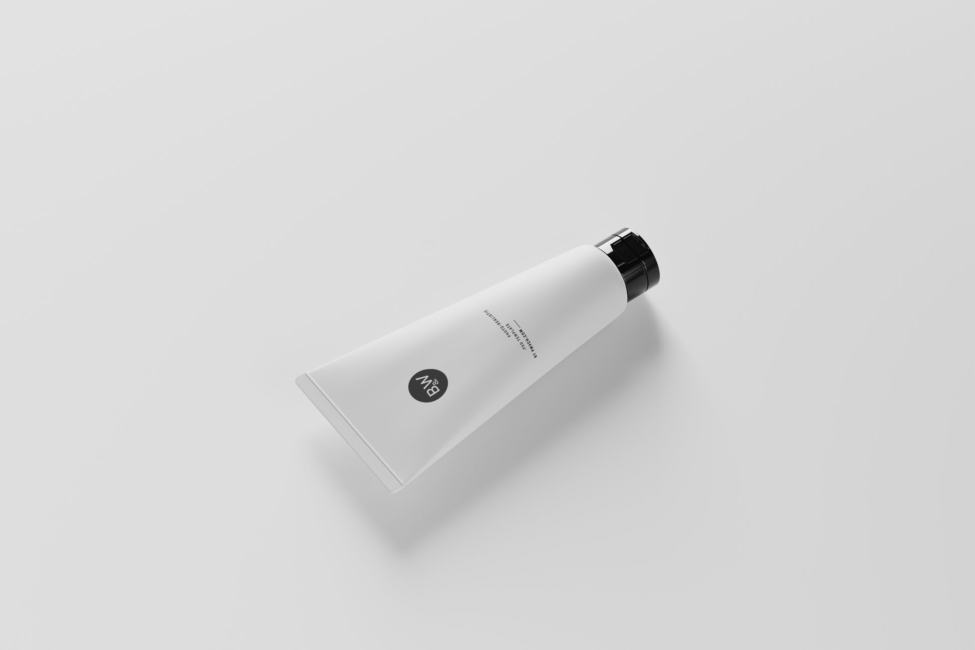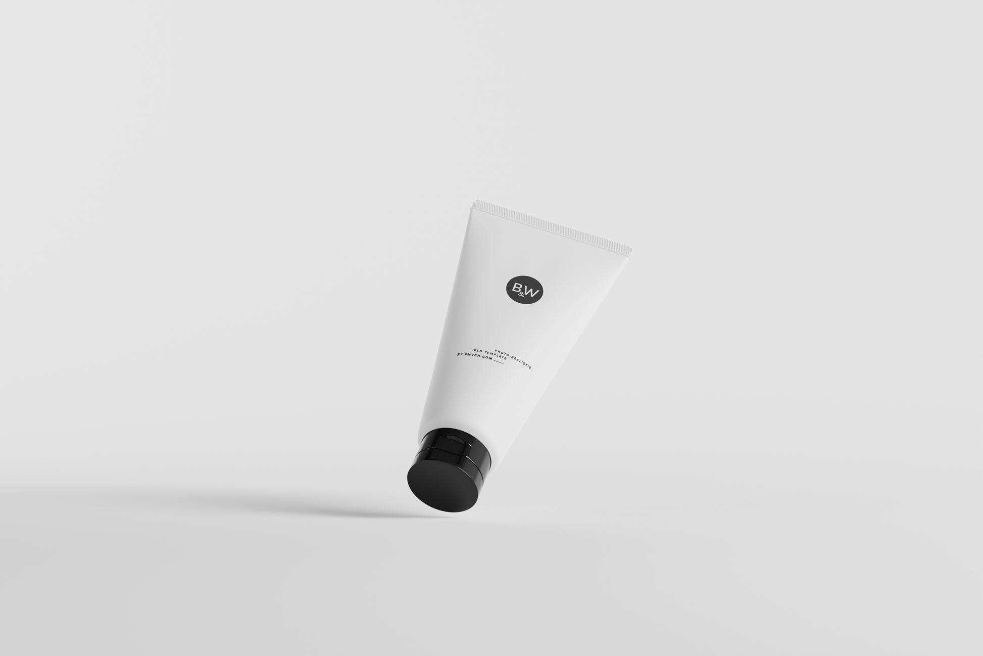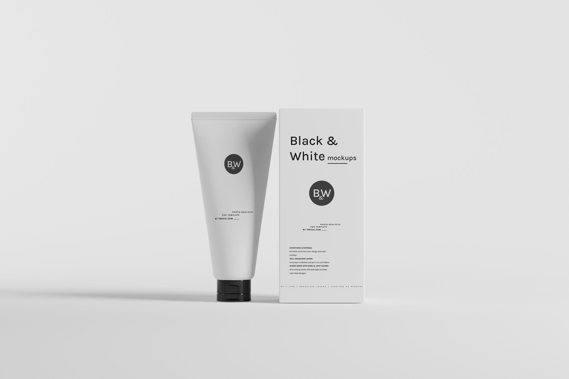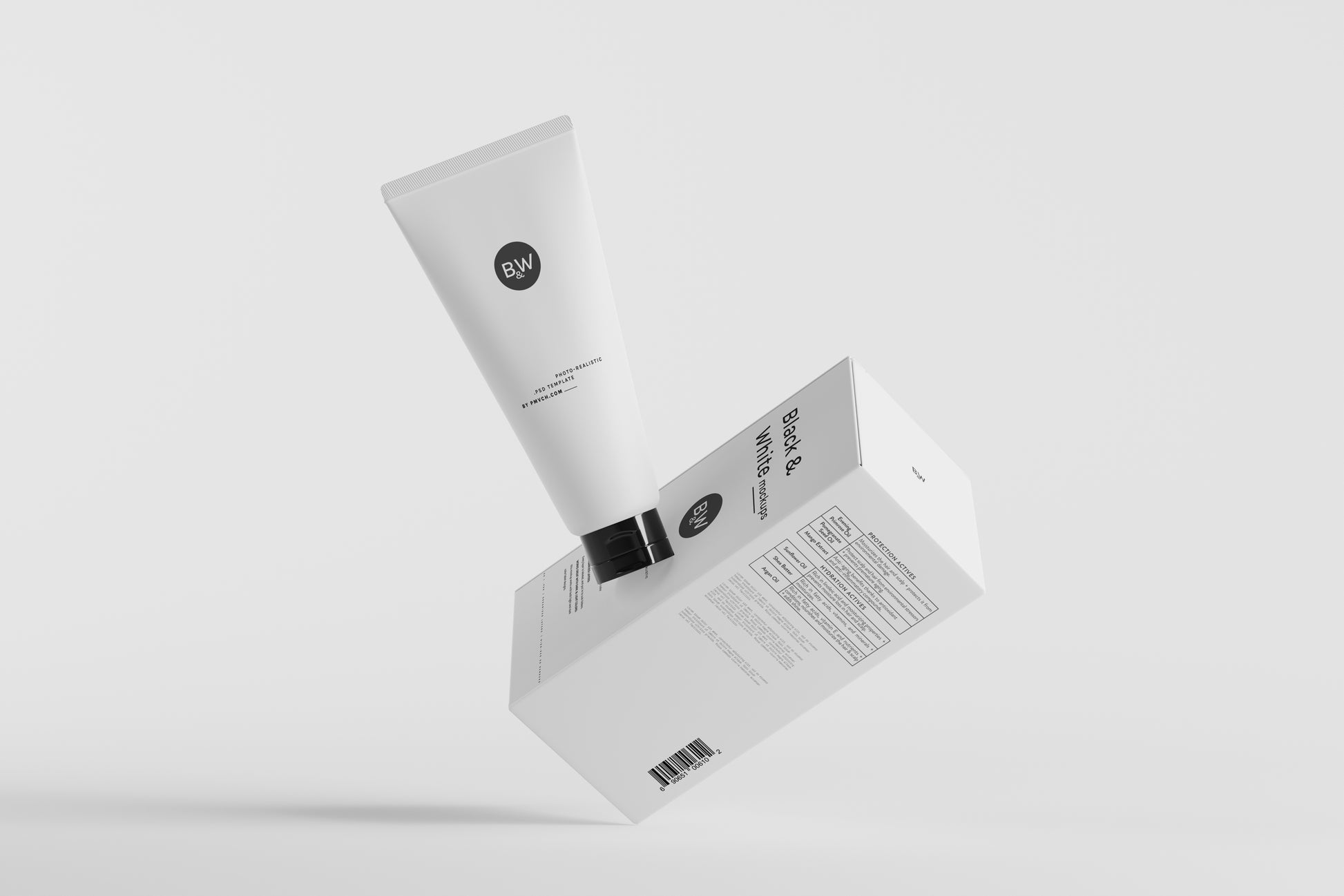The set includes four types of pump bottles, boxes, and a cream tube. For each mockup, you'll receive three formats: one with white bottles and white labels, one with black bottles and white labels, and one with black bottles and black labels. You'll find three different PSD files for each mockup scene, resulting in a total of 159 mockup files.