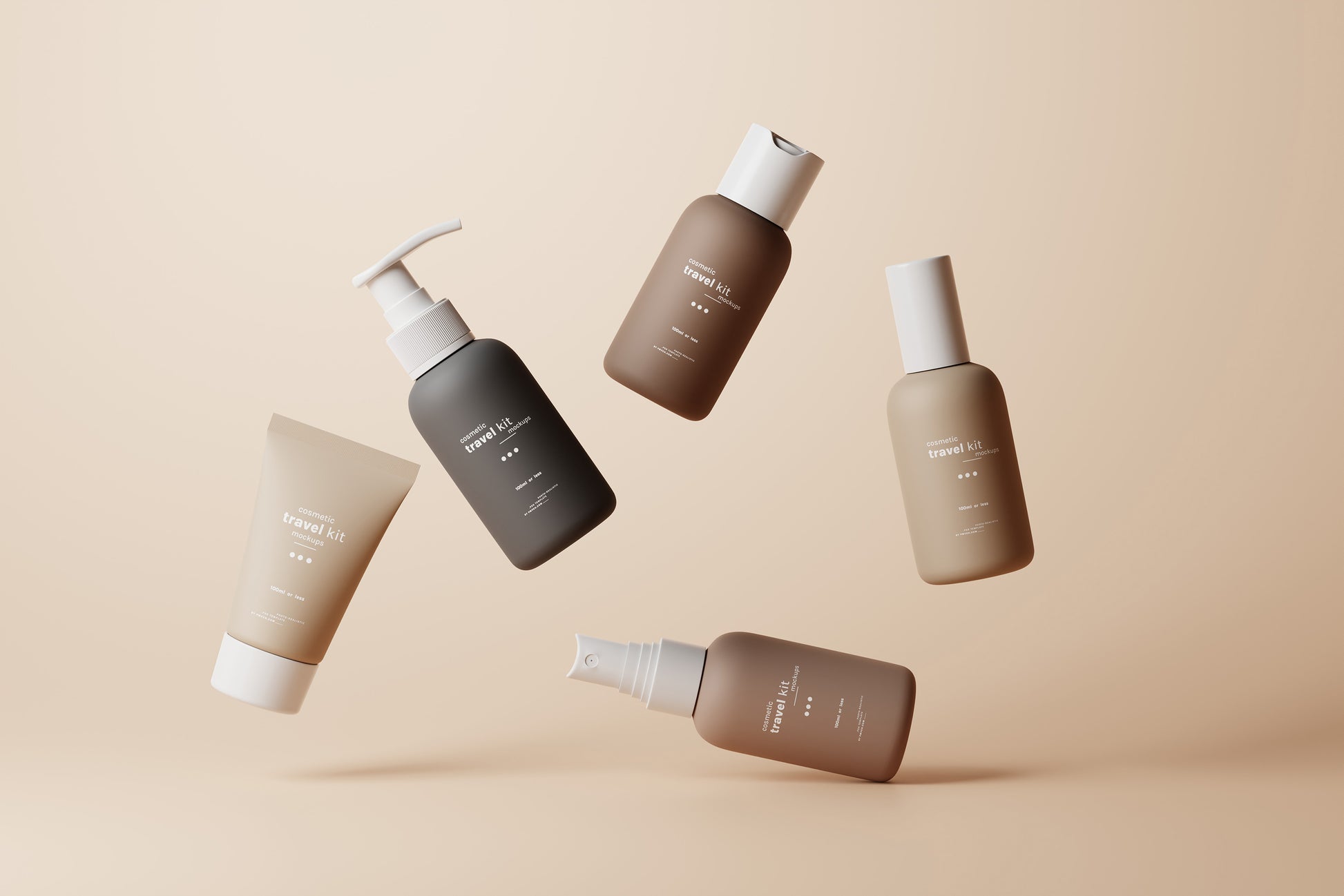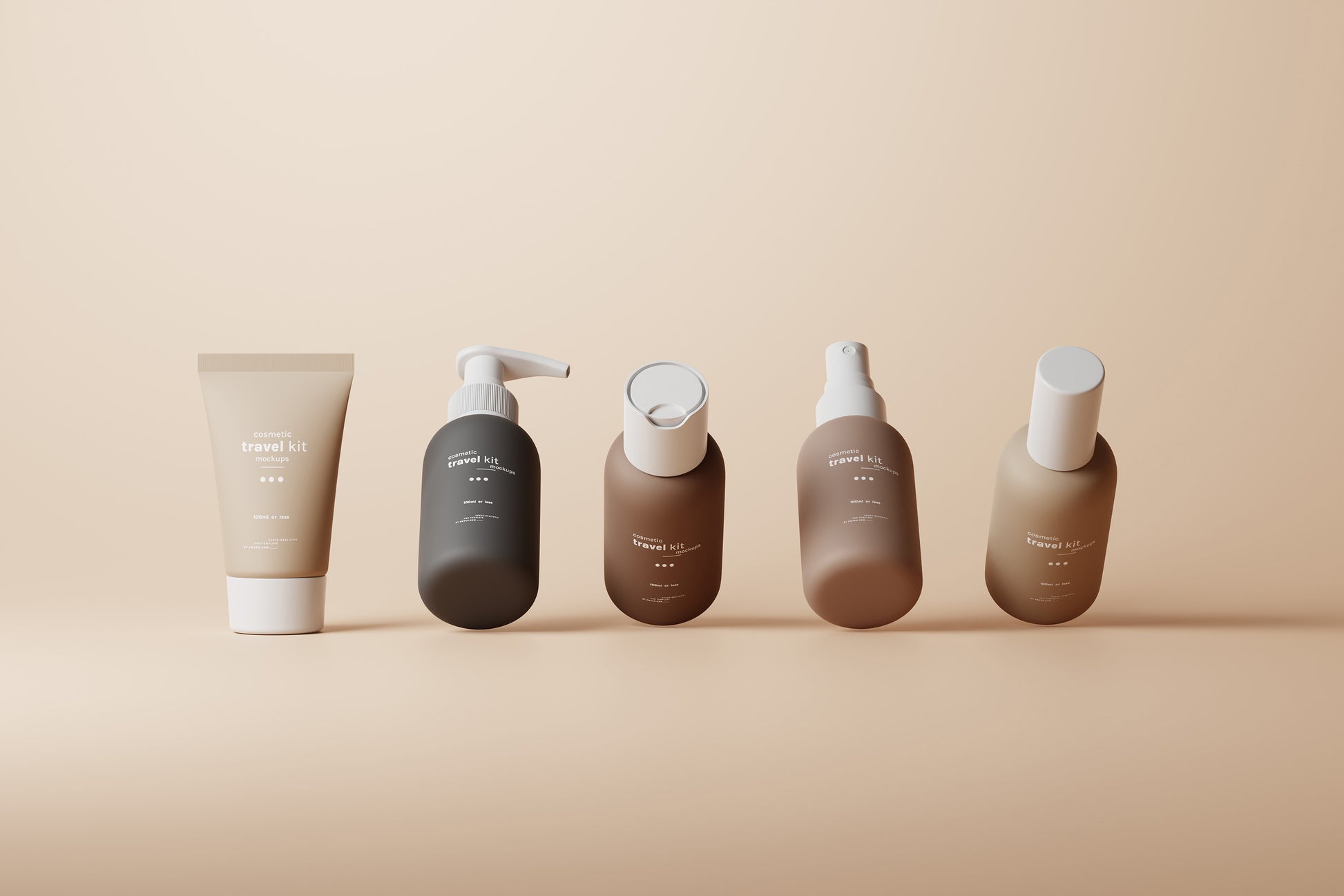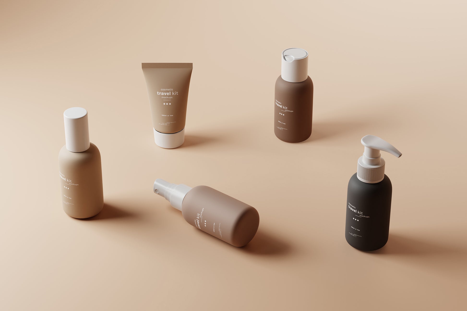 This set includes five mockups of small cosmetic products, perfect for cosmetic travel kits. The kit features four small-sized bottles and a tube, all under 100ml, making them ideal for travel purposes.
