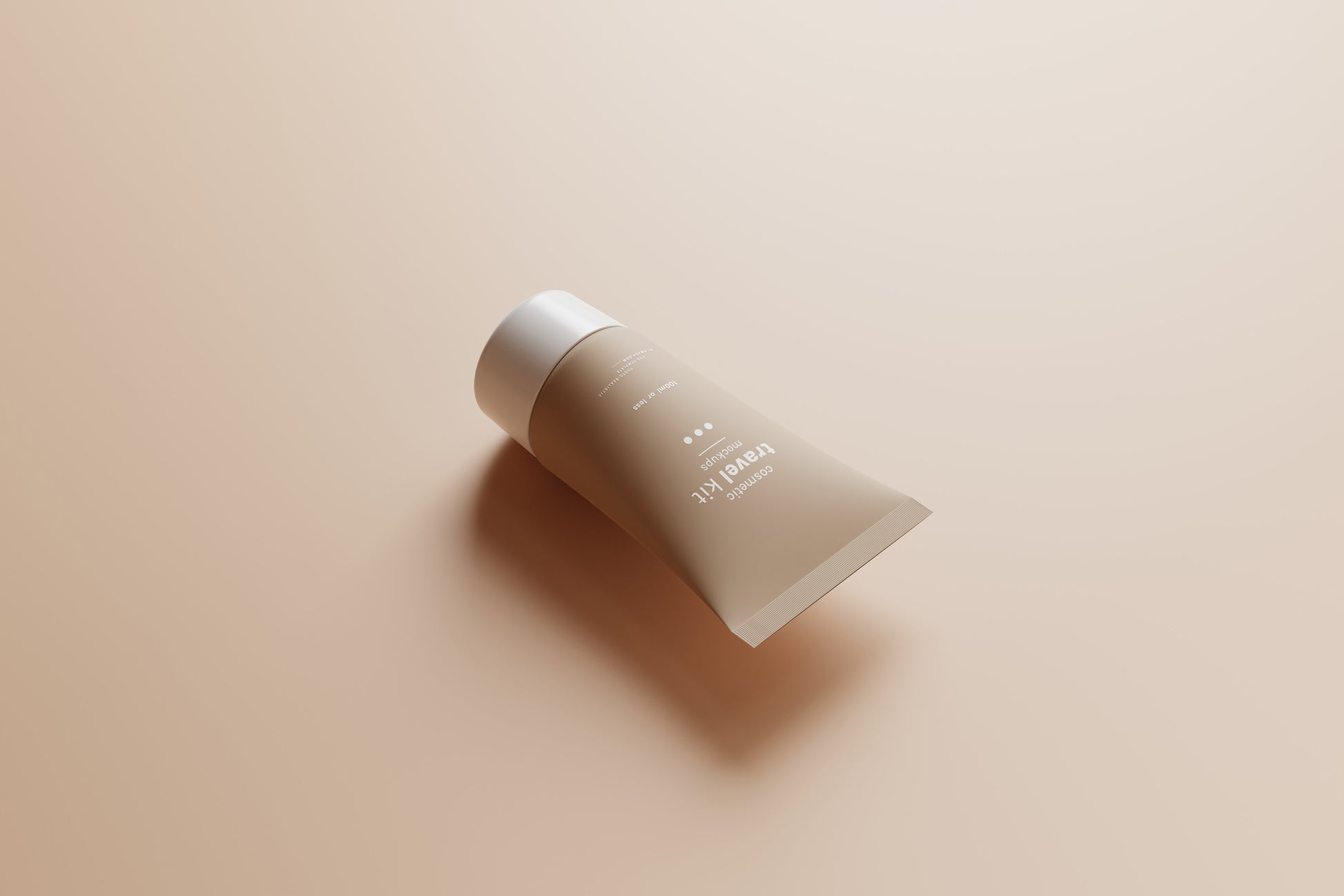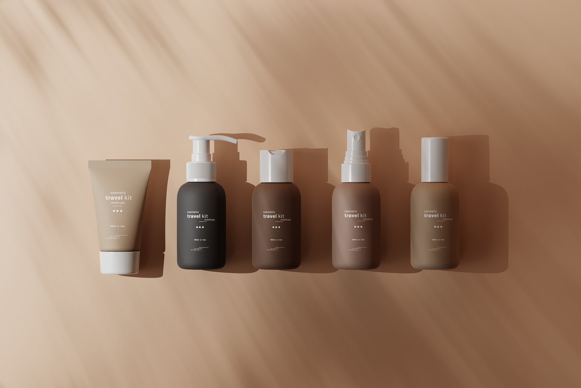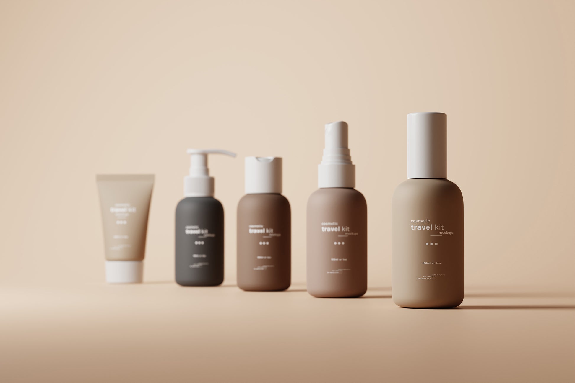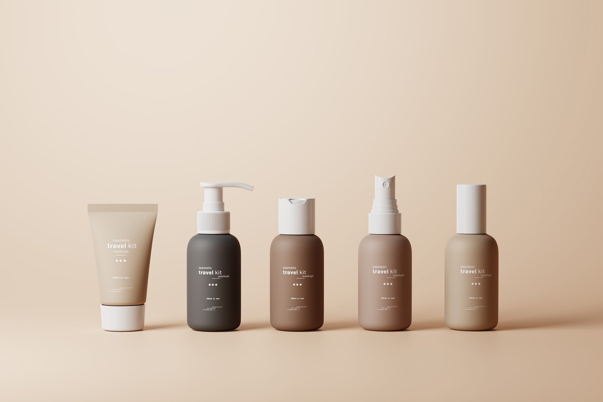This set includes five mockups of small cosmetic products, perfect for cosmetic travel kits. The kit features four small-sized bottles and a tube, all under 100ml, making them ideal for travel purposes.