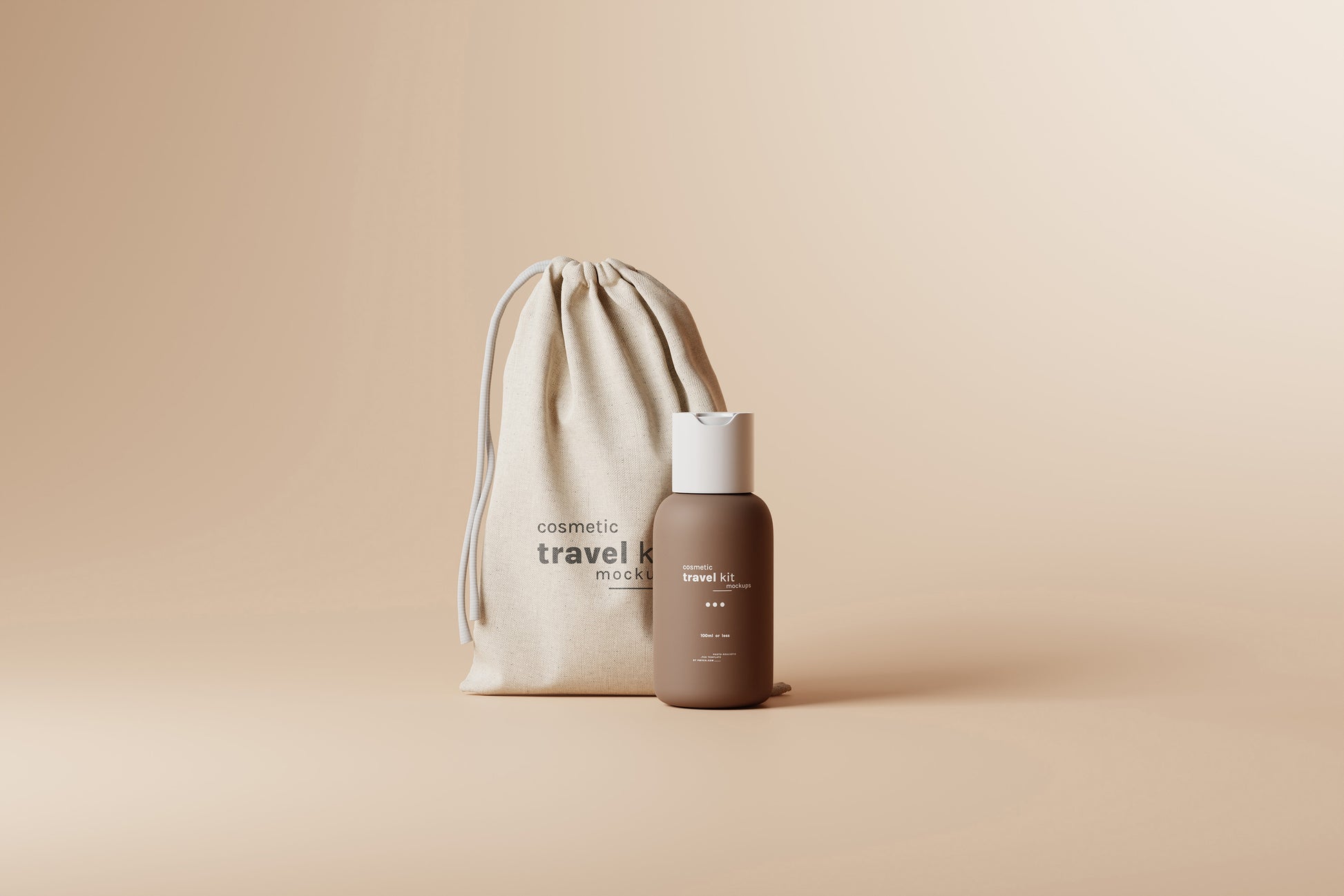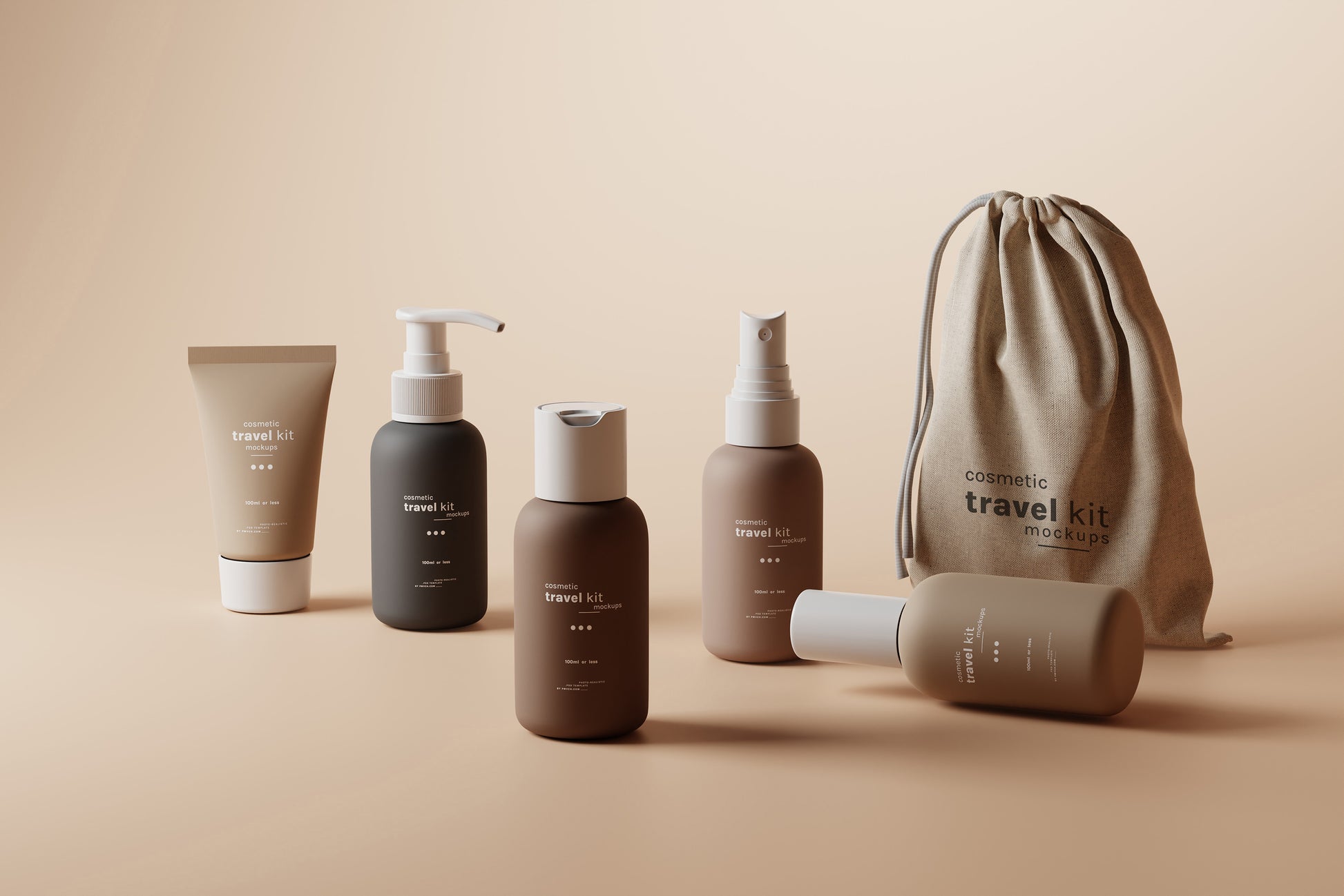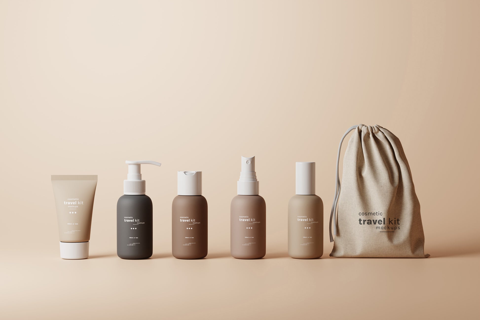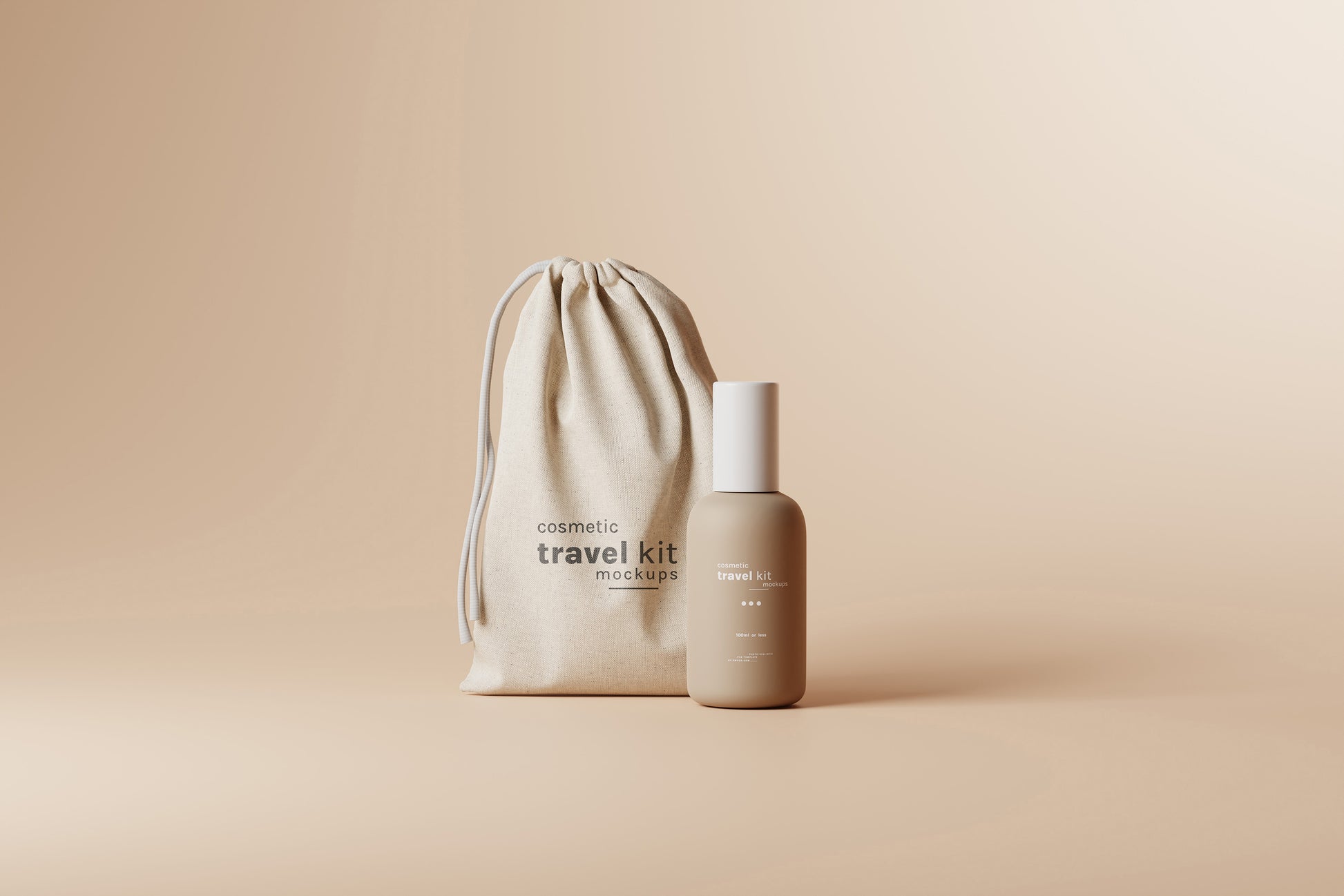 Cosmetic Travel Kit Mockup Scenes : Small cosmetic bottle and packaging mockups for cosmetic travel kits