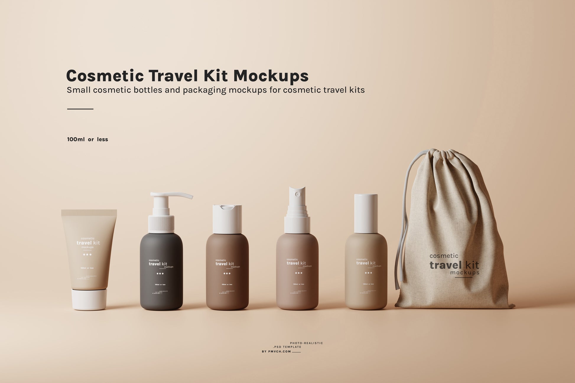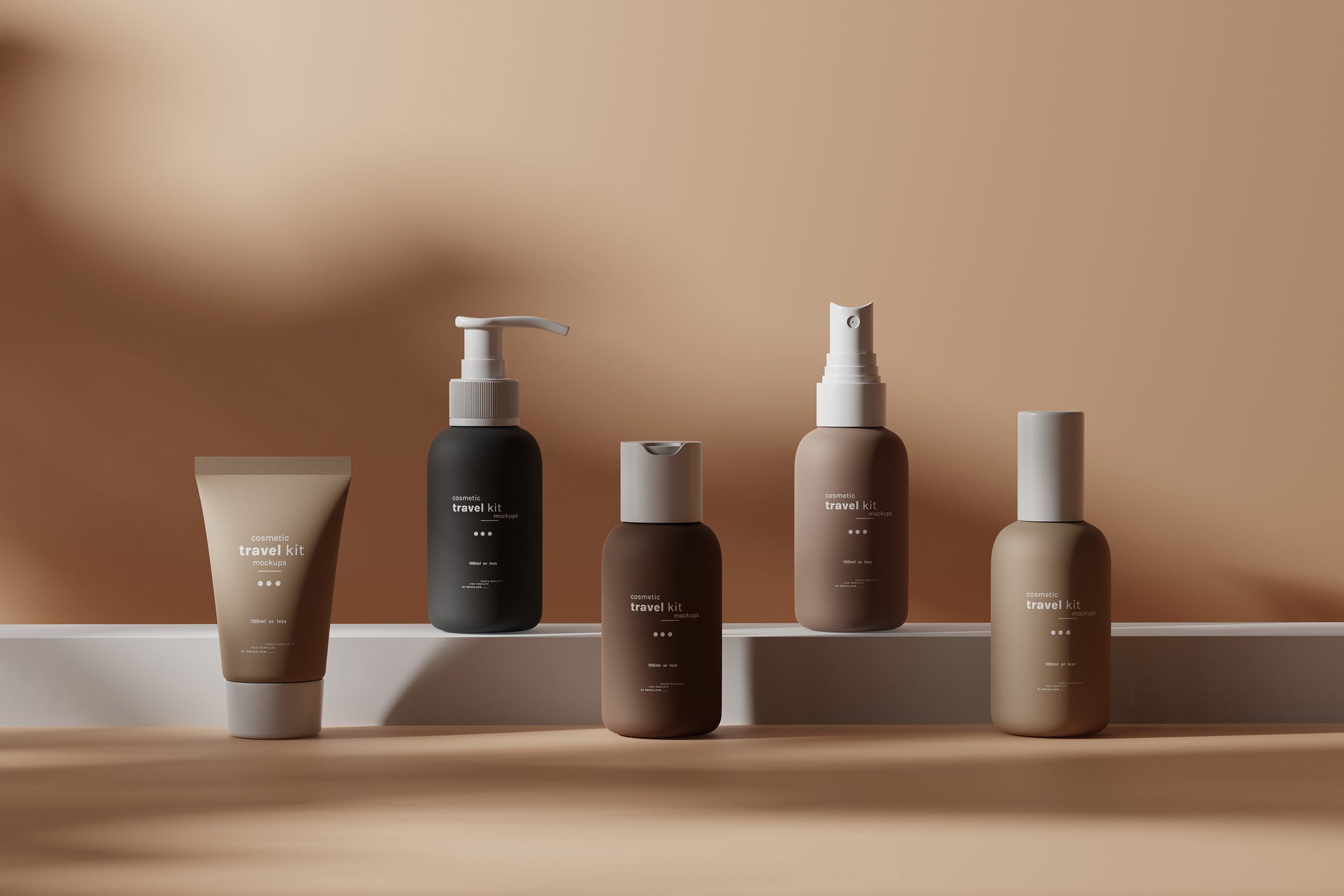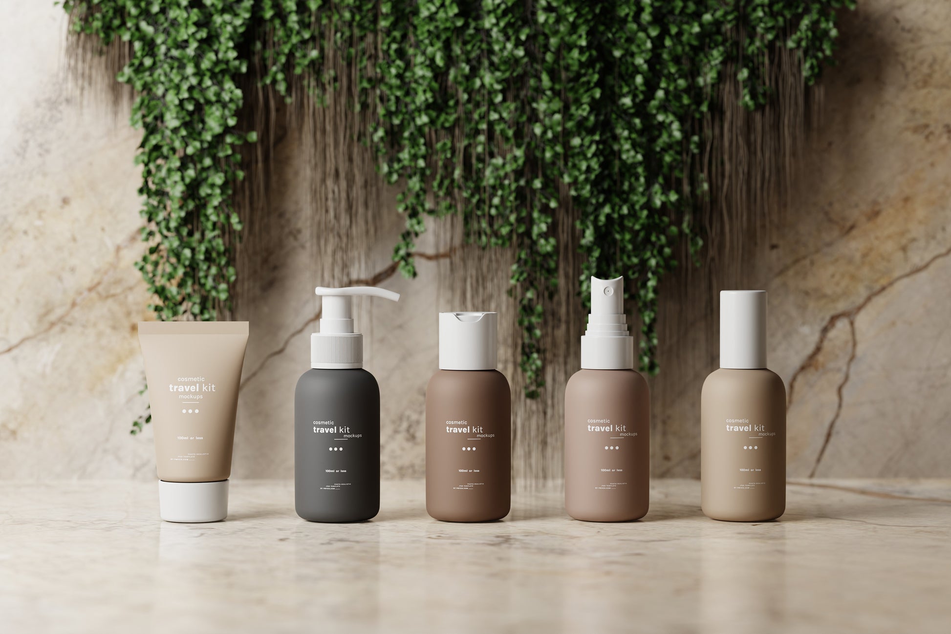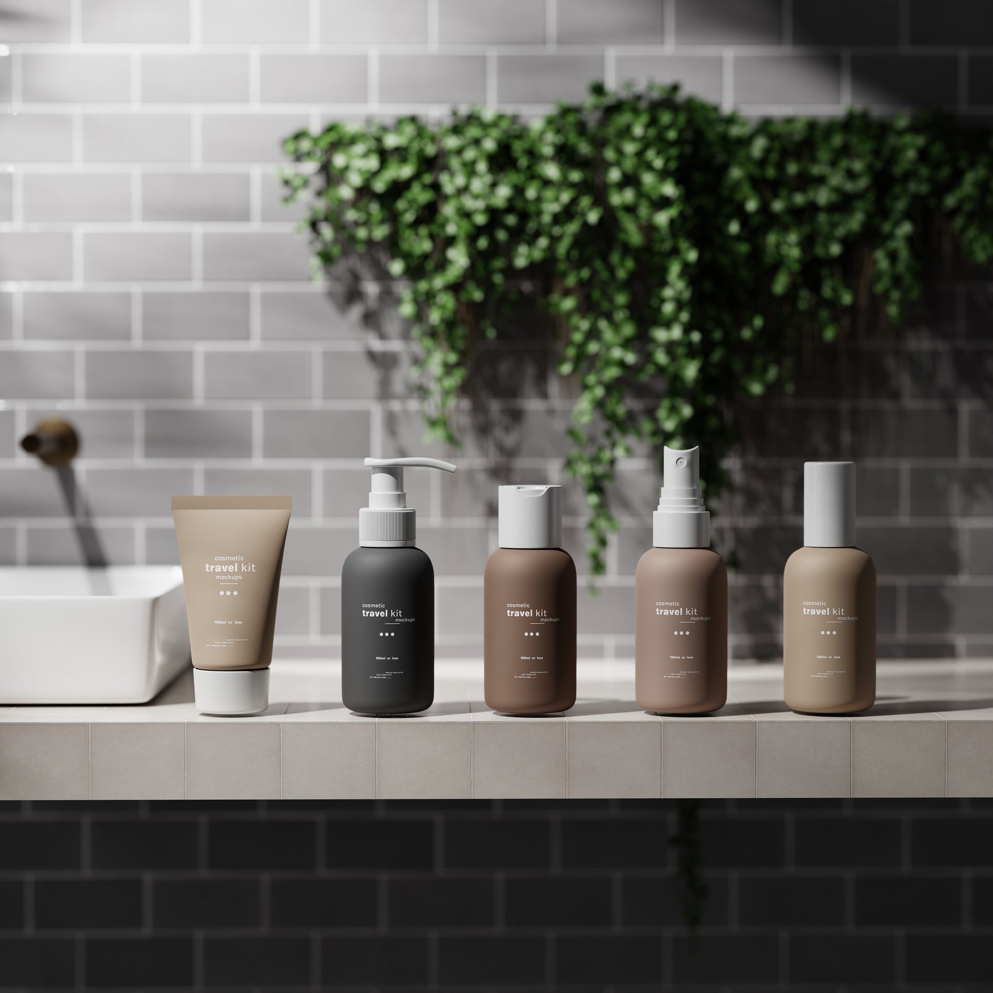 Cosmetic Travel Kit Mockup Scenes : Small cosmetic bottle and packaging mockups for cosmetic travel kits