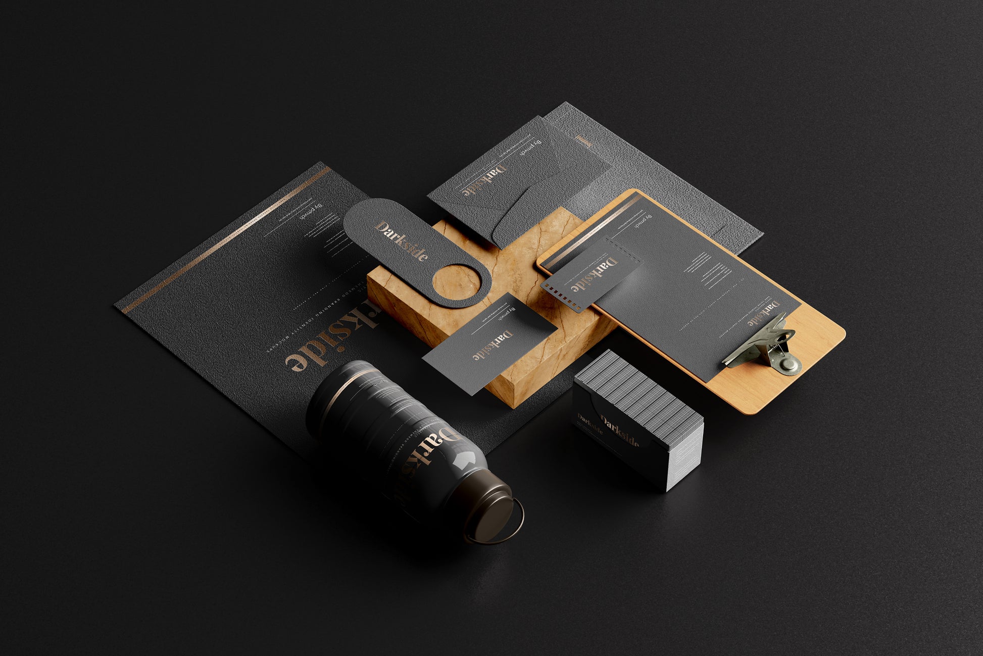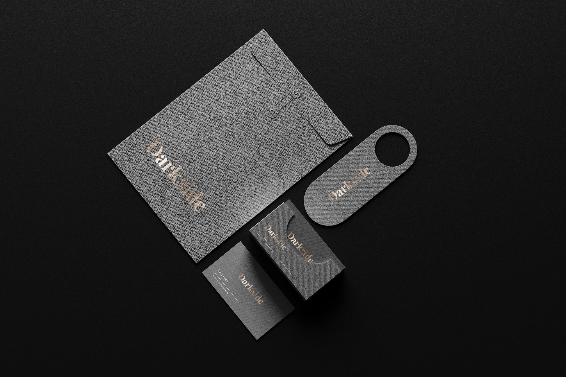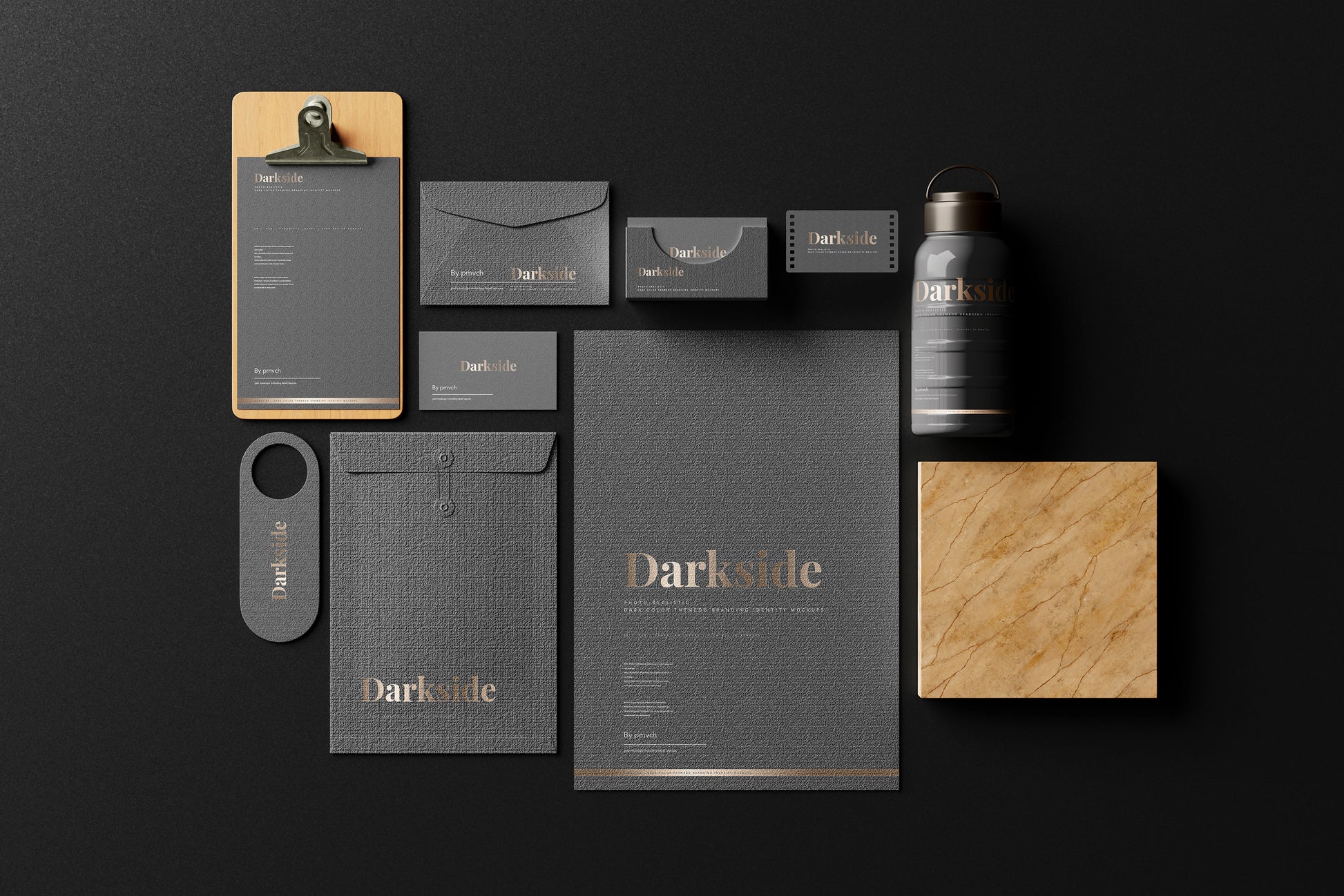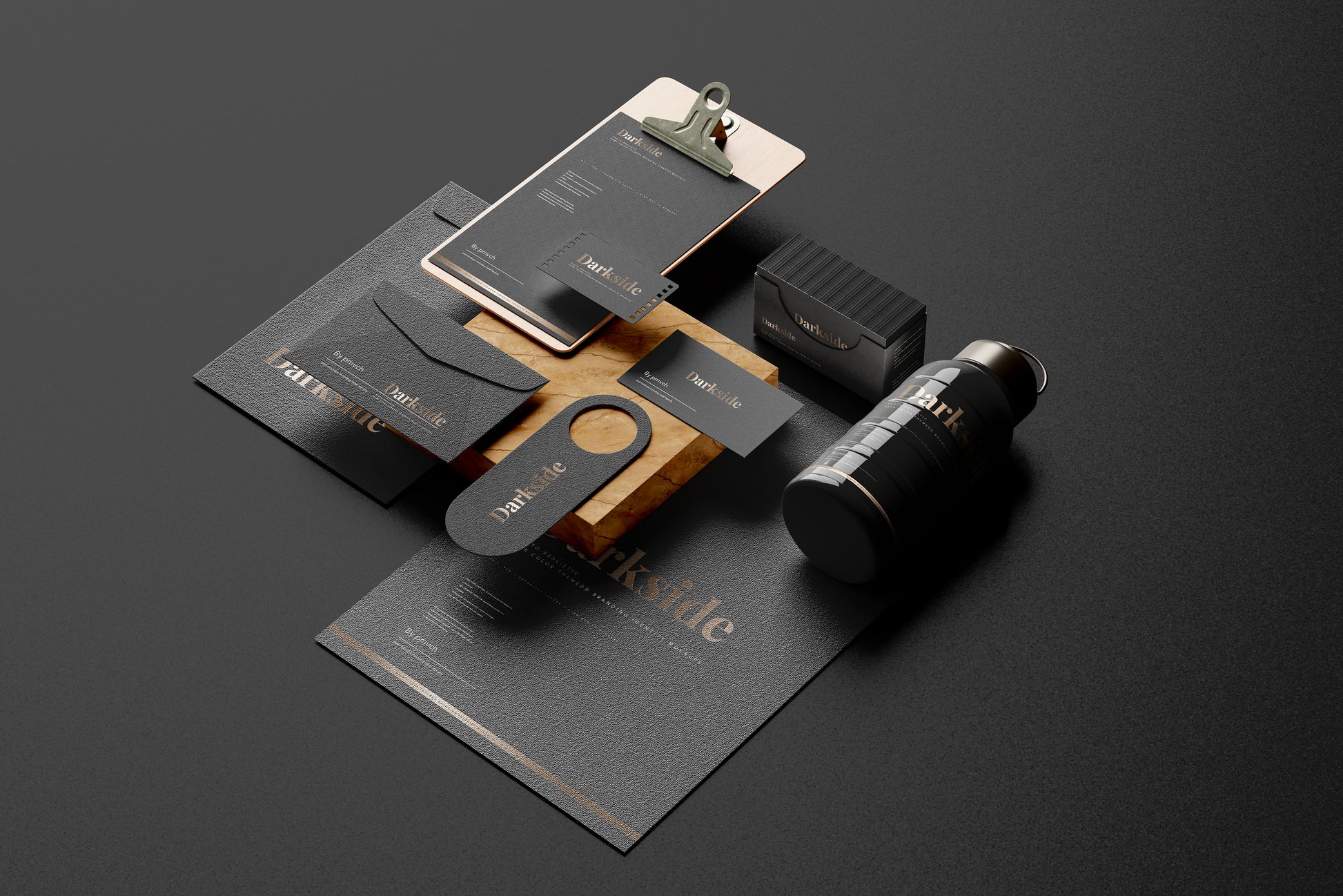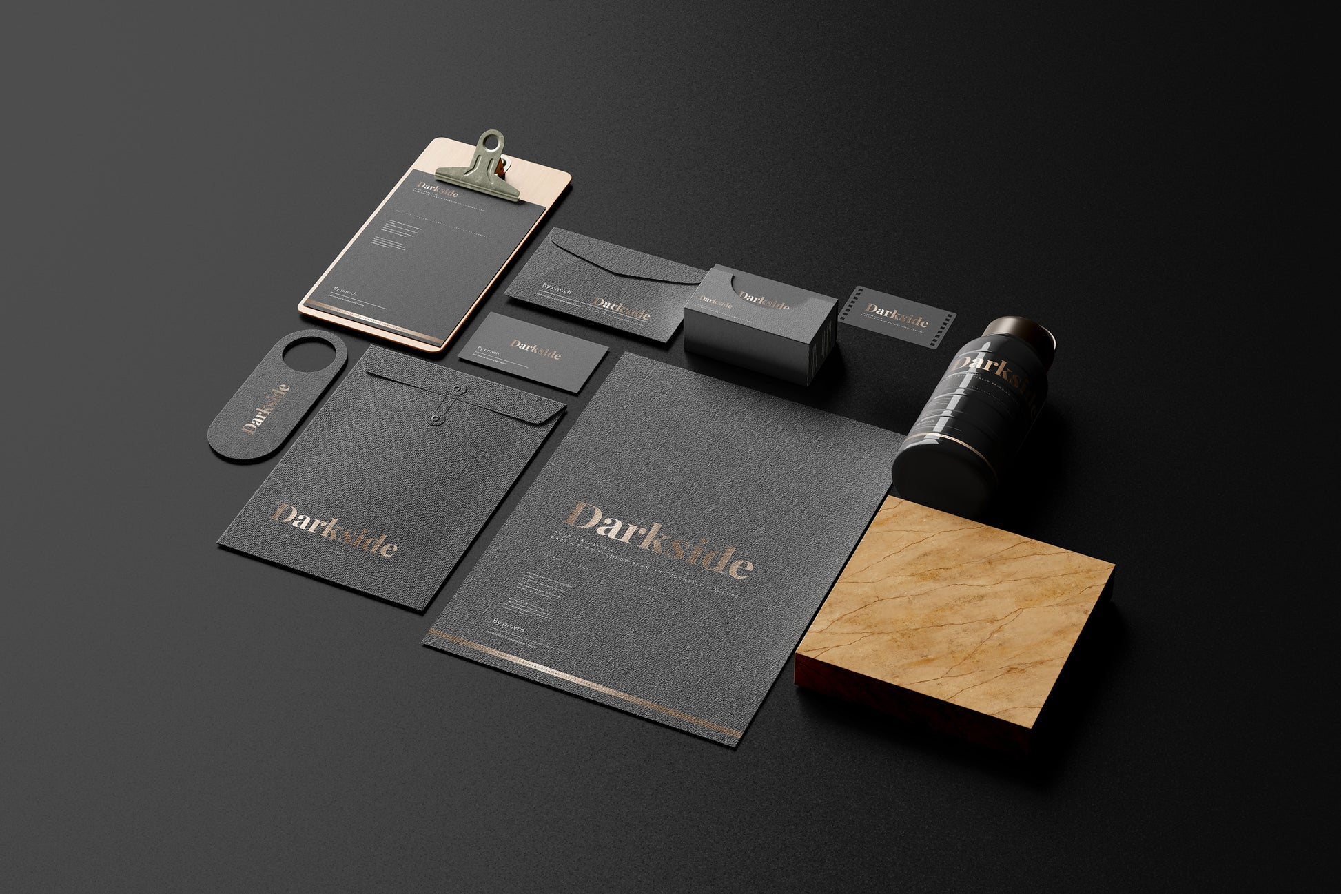 Whether it's for a presentation, portfolio, or promotional purposes, the "Darkside" mockup set offers a versatile range of options to elevate branding identity designs and leave a lasting impression.