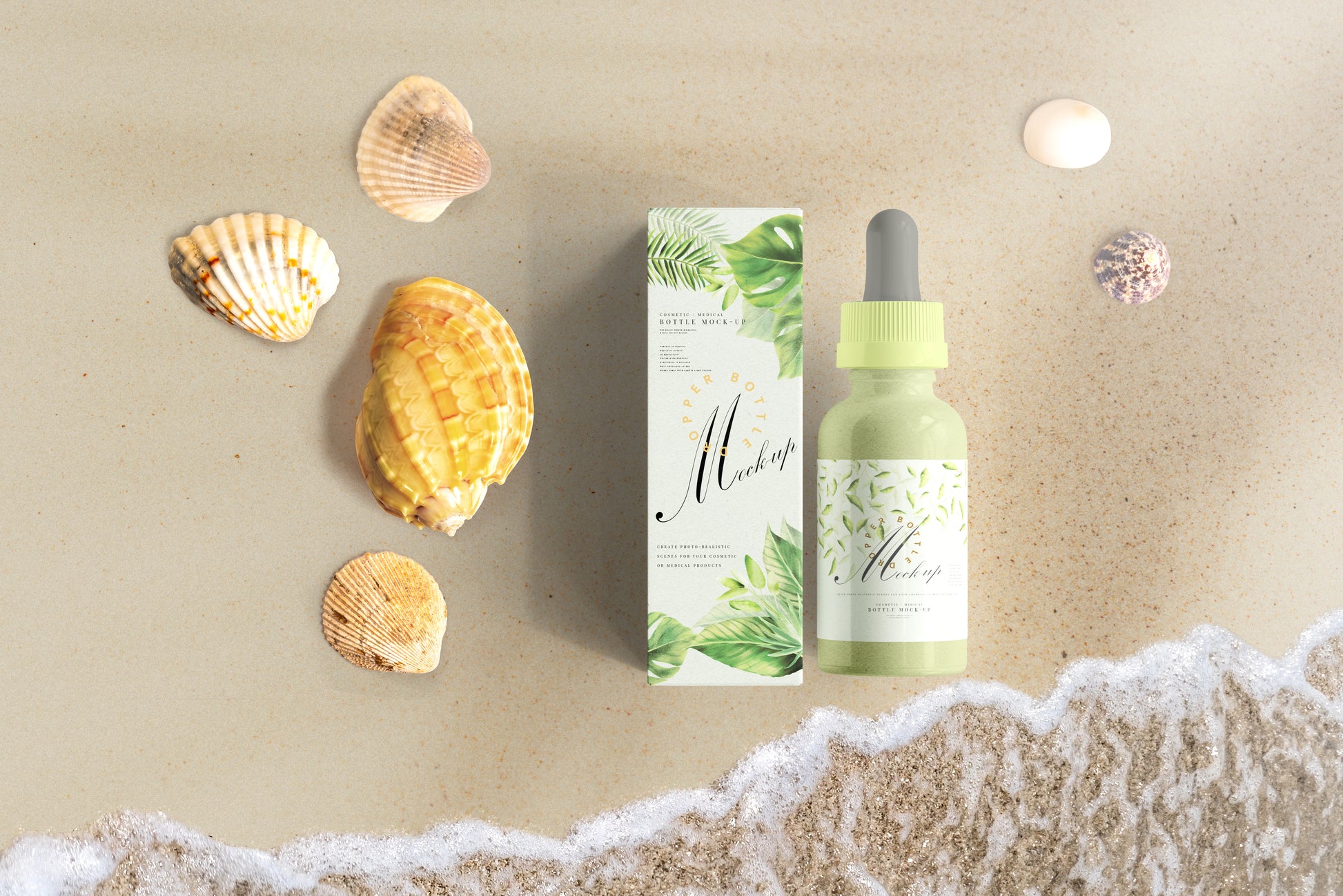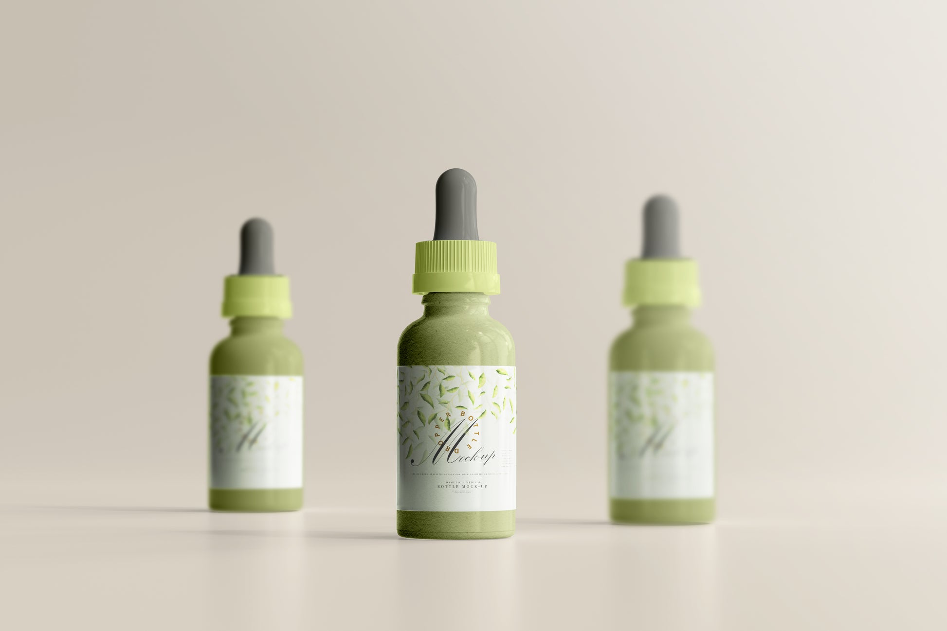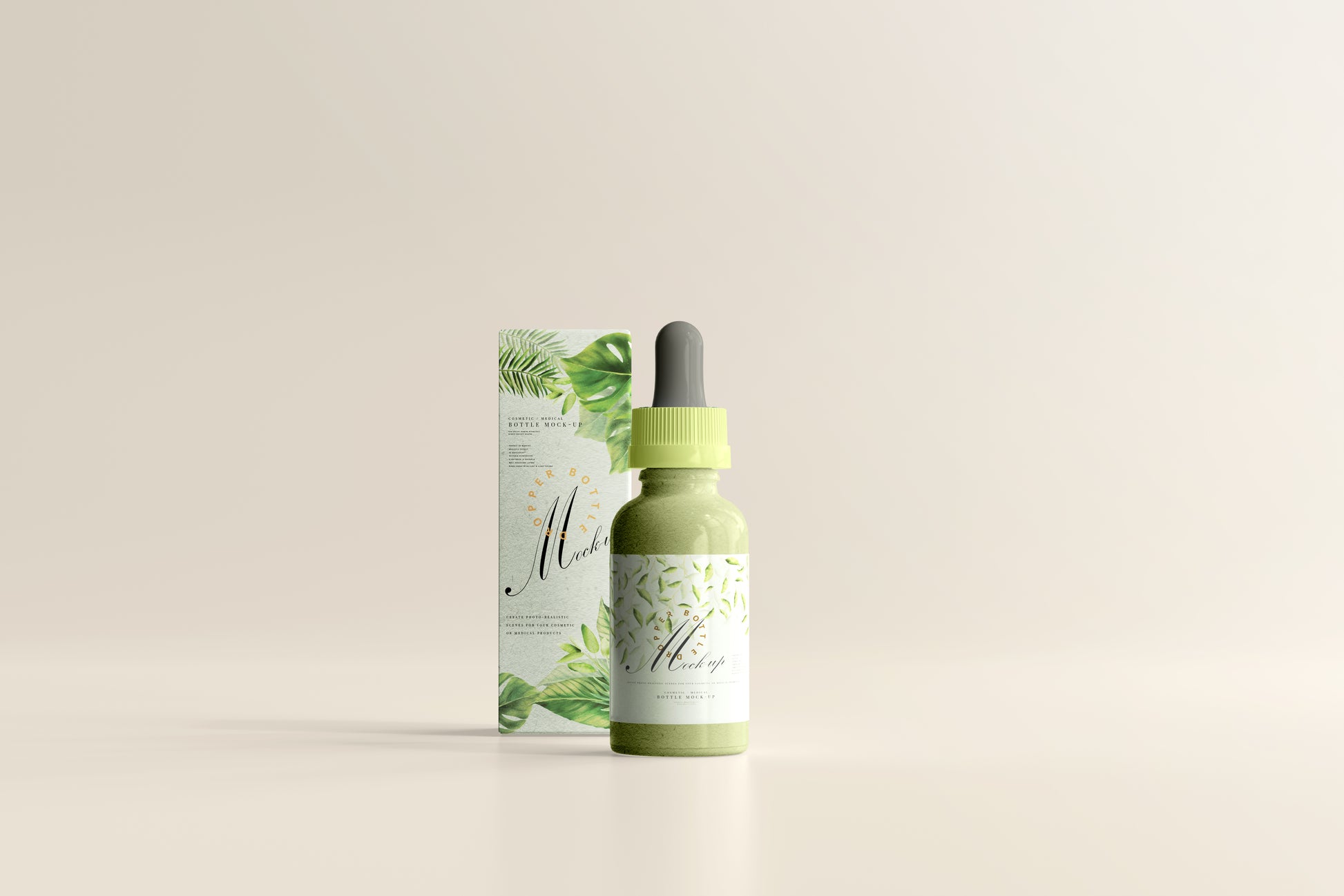 dropper bottle mockups with outer packaging and inner bottle. includes 15x scenes with various setups and viewing angles.