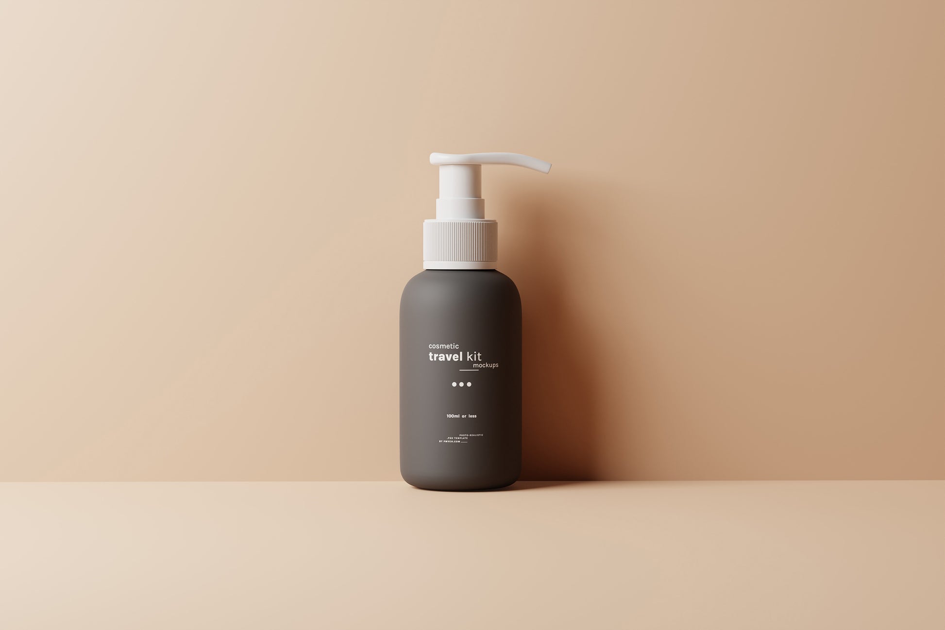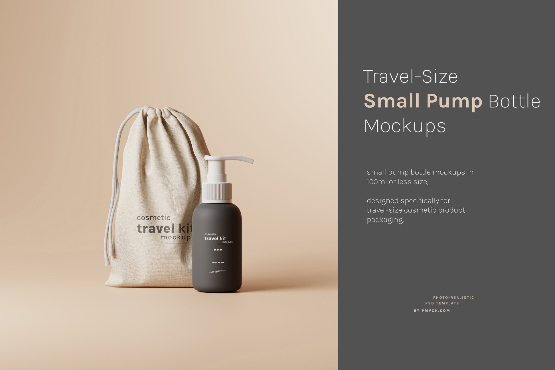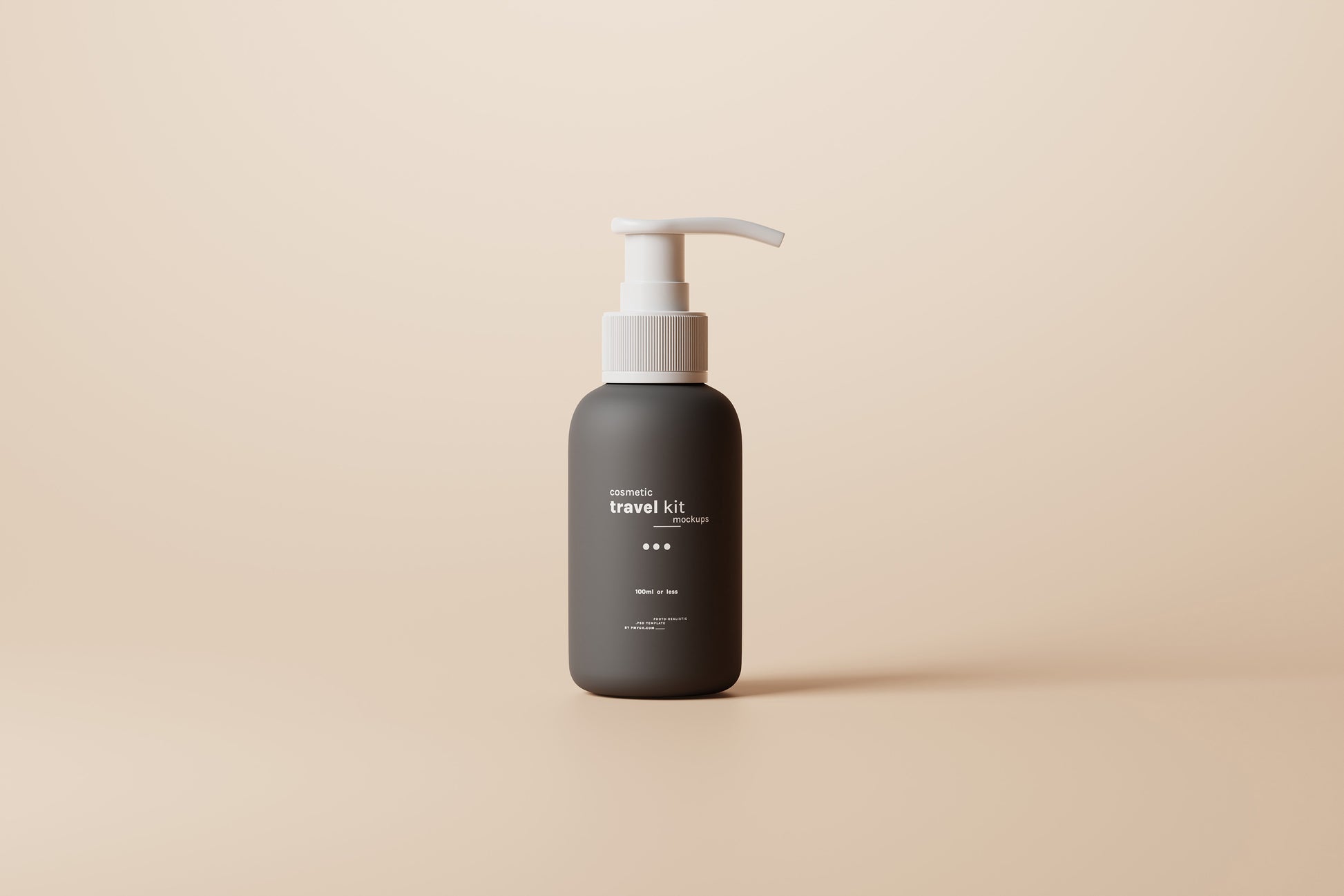 Presenting small pump bottle mockups in 100ml or less size, designed specifically for travel-size cosmetic product packaging.