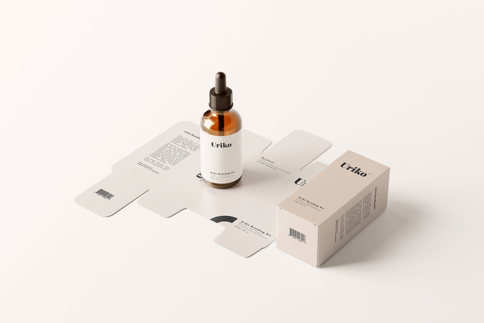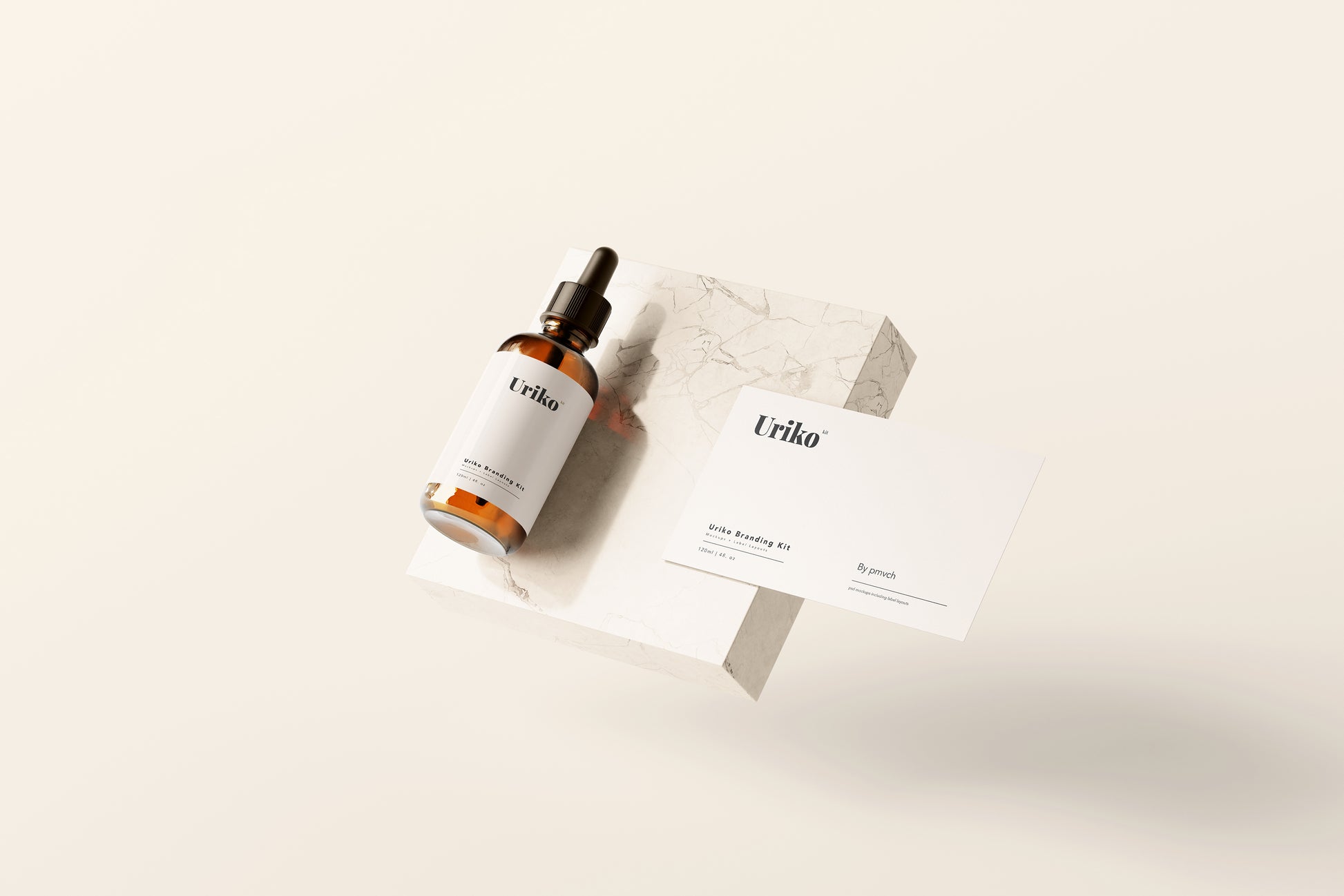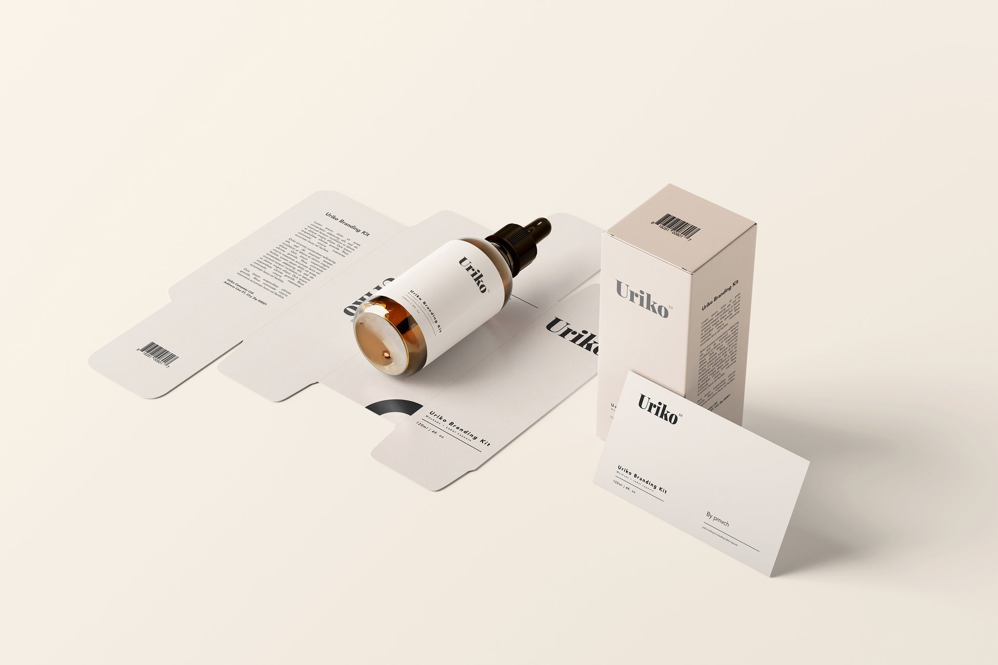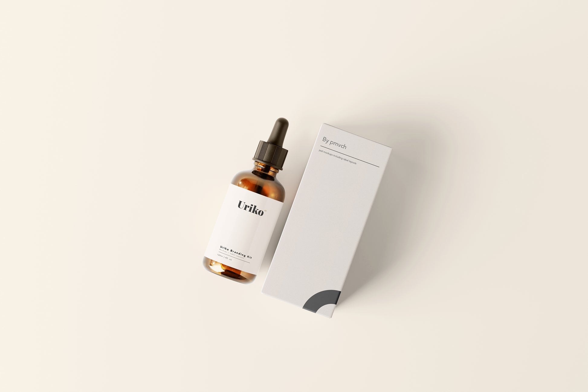 If you are looking for branding mockups or label templates this kit includes both. you can use the label design as well as mockups to showcase your products. This set features a plastic bottle, an amber glass dropper bottle and a cream tube as the main products. also includes a box, an unfolded box and business cards.