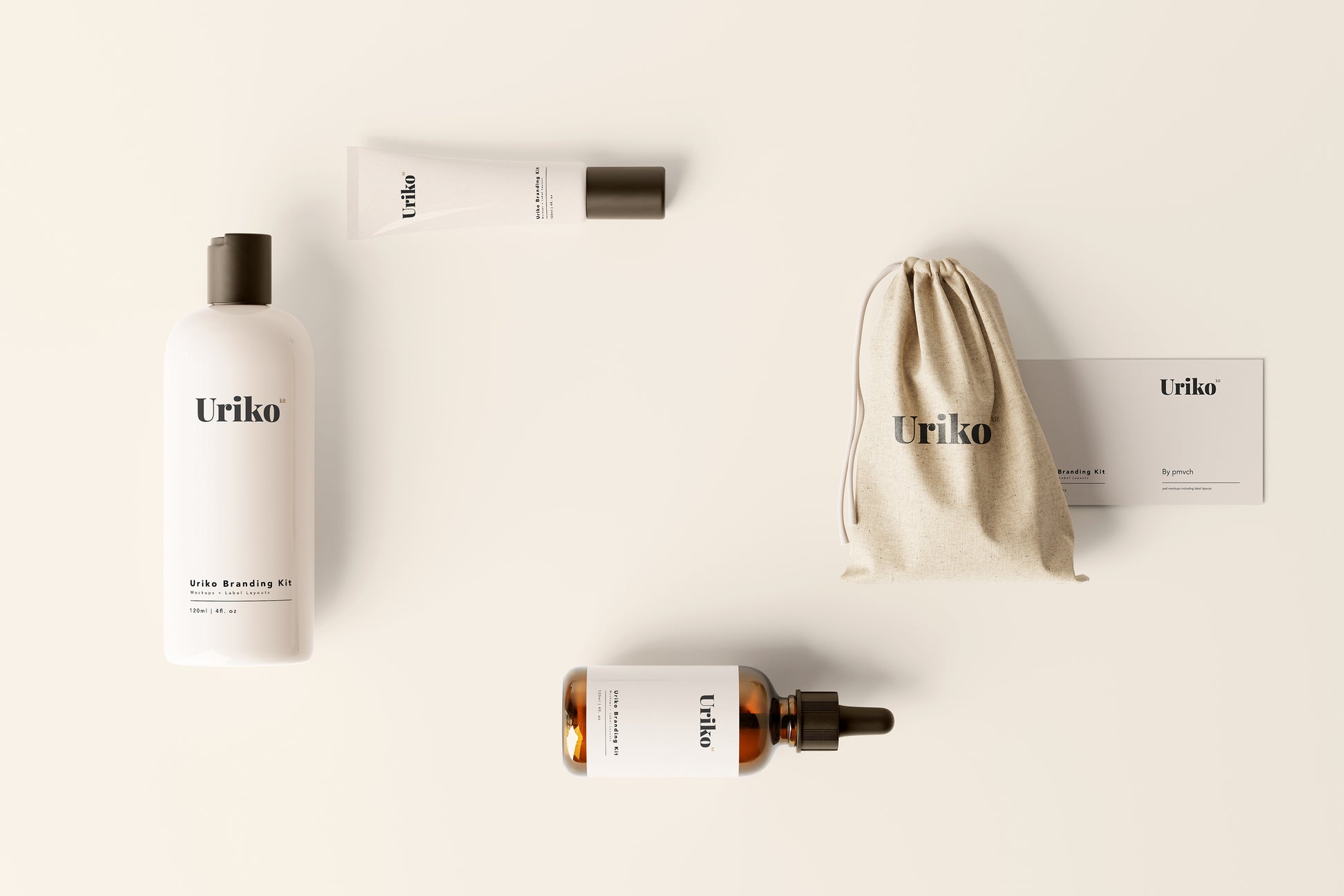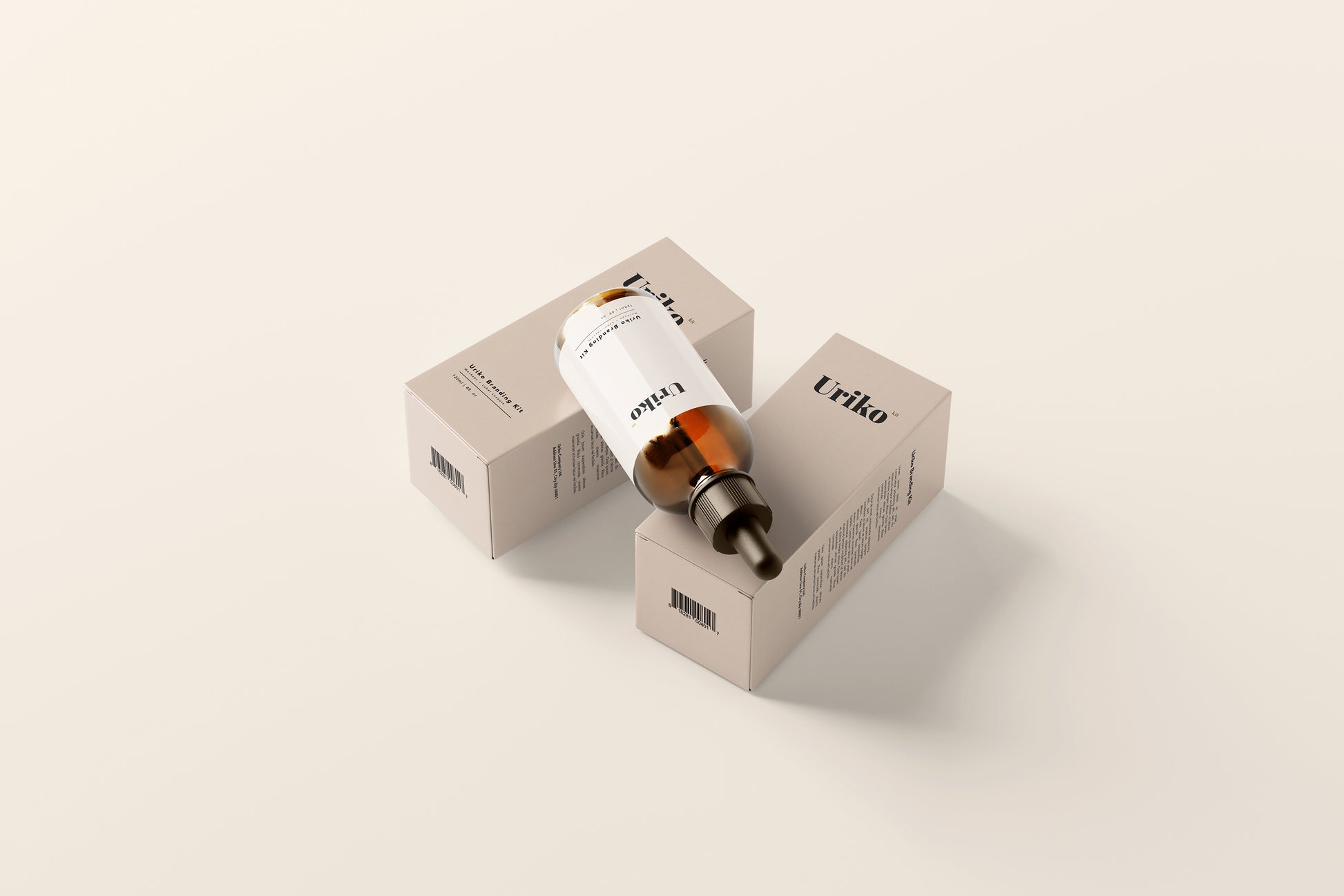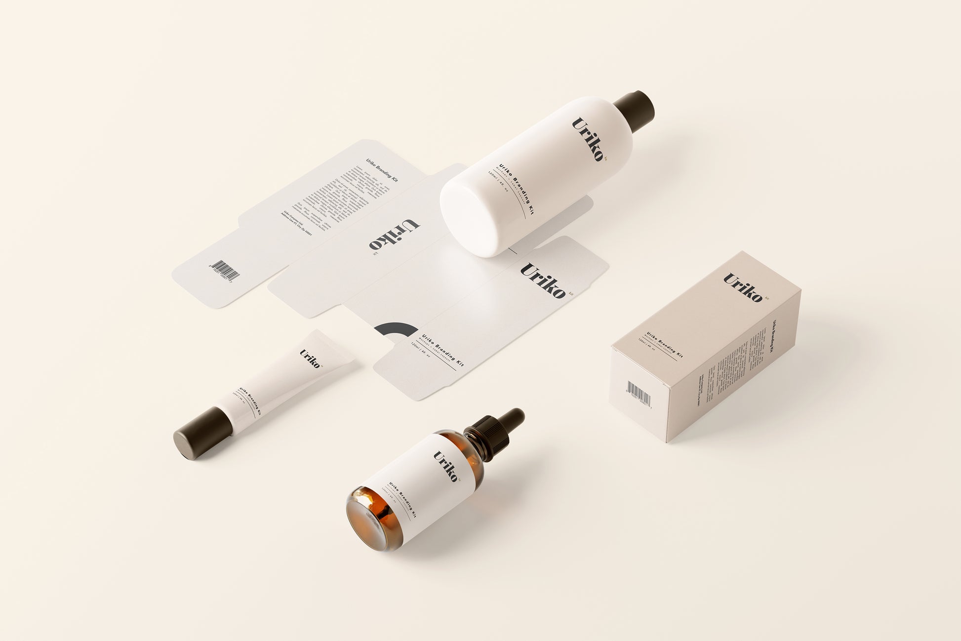 If you are looking for branding mockups or label templates this kit includes both. you can use the label design as well as mockups to showcase your products. This set features a plastic bottle, an amber glass dropper bottle and a cream tube as the main products. also includes a box, an unfolded box and business cards.